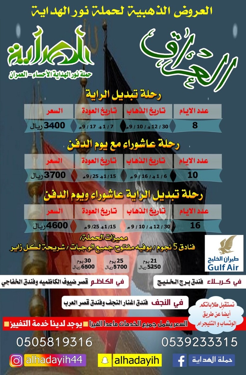 تعلن حملة نور الهداية بالاحساء عن تسيير رحلاتها للعراق في عاشوراء الحسين والدفن..