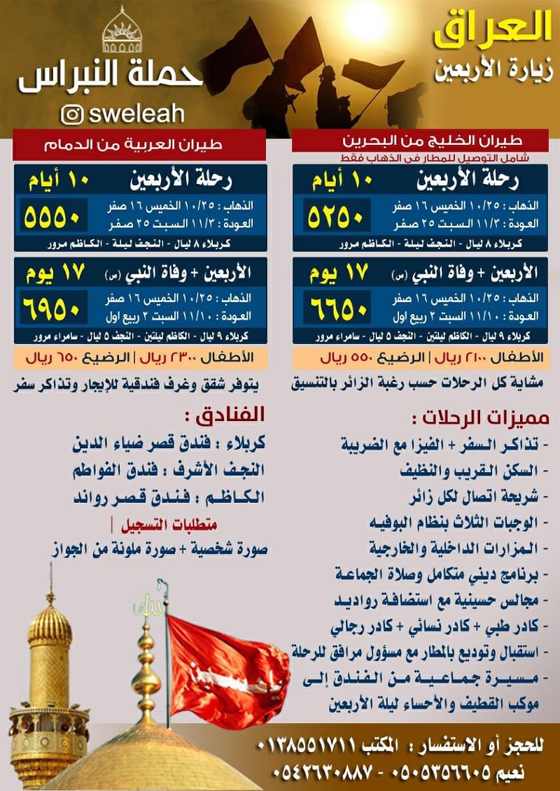 تعلن حملة النبراس بالخويلديه عن تيسير رحلاتها في أربعين اباعبدالله الحسين الى العراق