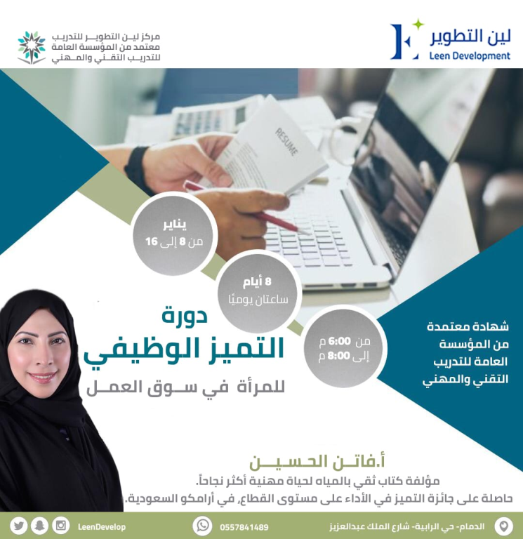 سيهات.. «لين التطوير» ينظم دورة للتميز الوظيفي بشهادة معتمدة للسيدات