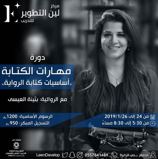 ينظم مركز لين للتطوير دورة «مهارات الكتابة» للسيدات، باستضافة الكاتبة والروائية بثينة العيسى لأول مرة في المنطقة الشرقية على مدى ثلاثة أيام.