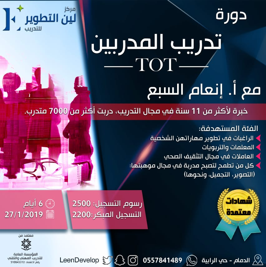 ينظم مركز لين التطوير دورة تدريب المدربين TOT، بشهادة معتمدة من المؤسسة العامة للتدريب التقني والمهني TVTC.