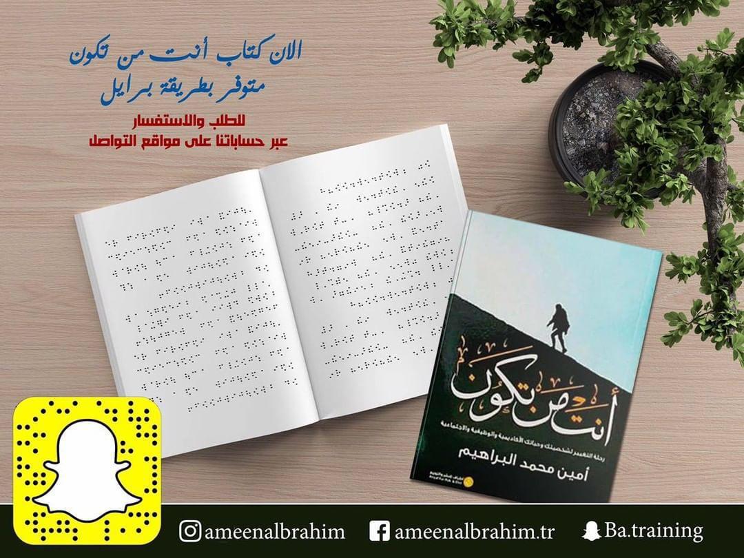 بهذه الكلمات ابتدأ الكاتب والمدرب «أمين البراهيم» رسالته الترويجية للإعلان في 25 مارس 2019 م عن طباعة توفر كتابه «أنت من تكون؟» f'vdrm برايل والتي تتيح للأكفّاء الخوض في غمار رحلة التغيير في كتابه.