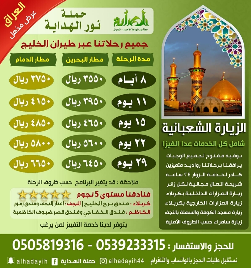 تعلن حملة نور الهداية عن عرضها المذهل للزيارة الشعبانية إلى العراق عبر طيران الخليج.