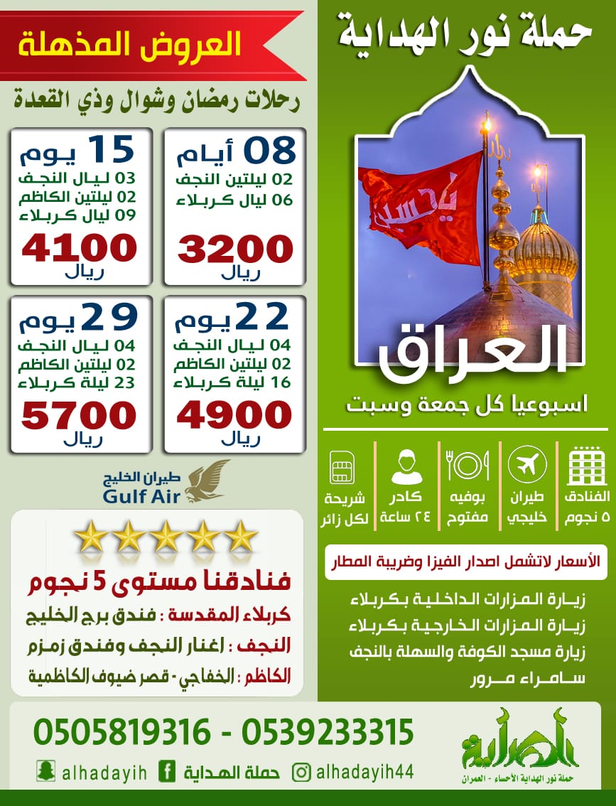 حملة ”نور الهداية“ تقدم لكم عروضها المذهلة لرحلات العراق في رمضان وشوال وذو القعدة..