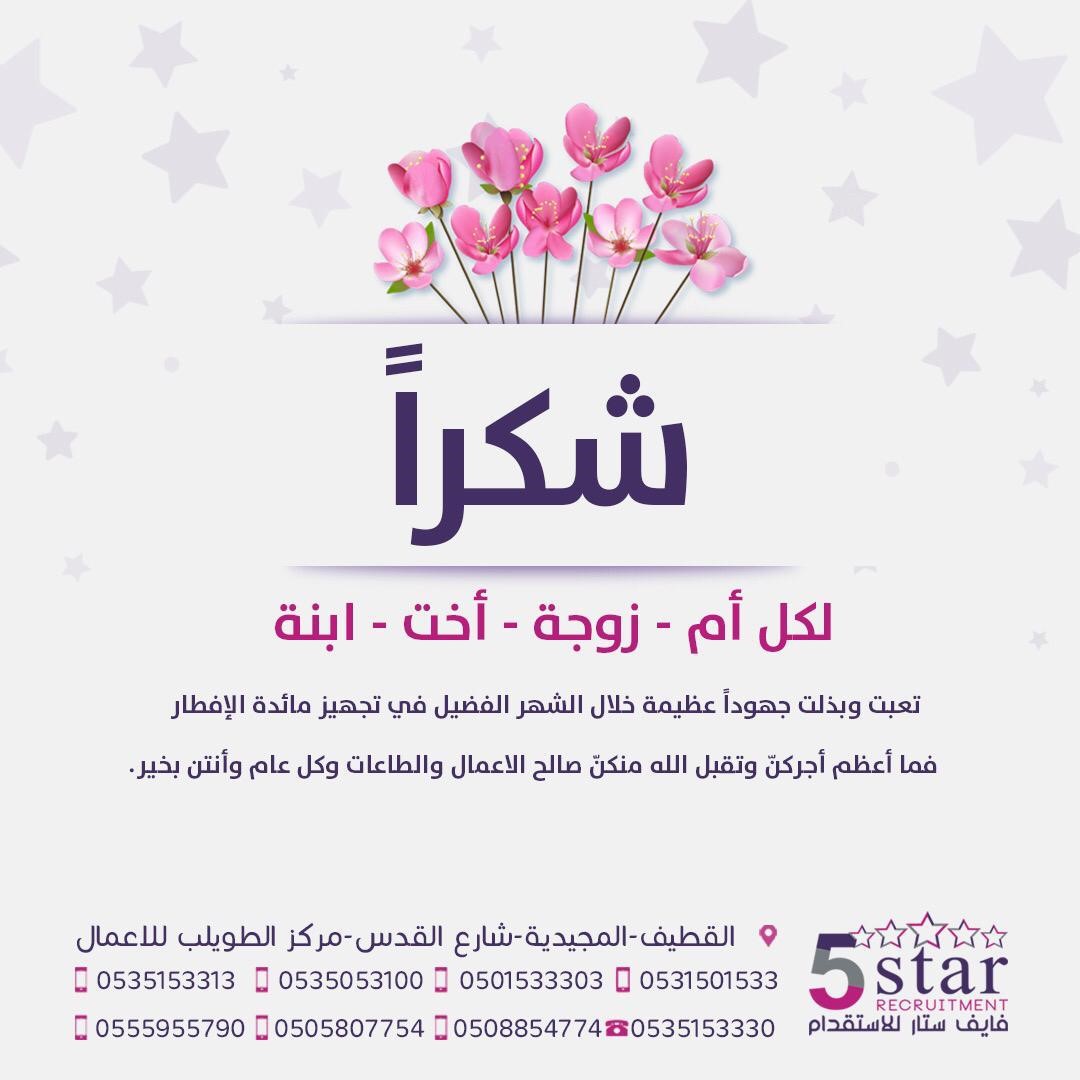 🌟⚡شكرآ من القلب ❤ من مكتب فايف ستار للإستقدام إلى كل أم زوجة أخت إبنة تعبت وبذلت جهودآ عظيمة خلال الشهر الفضيل في تجهيز مائدة الإفطار فما أعظم أجركن وتقبل الله منكن صالح الأعمال والطاعات وكل عام وأنتم بخير ⚡🌟