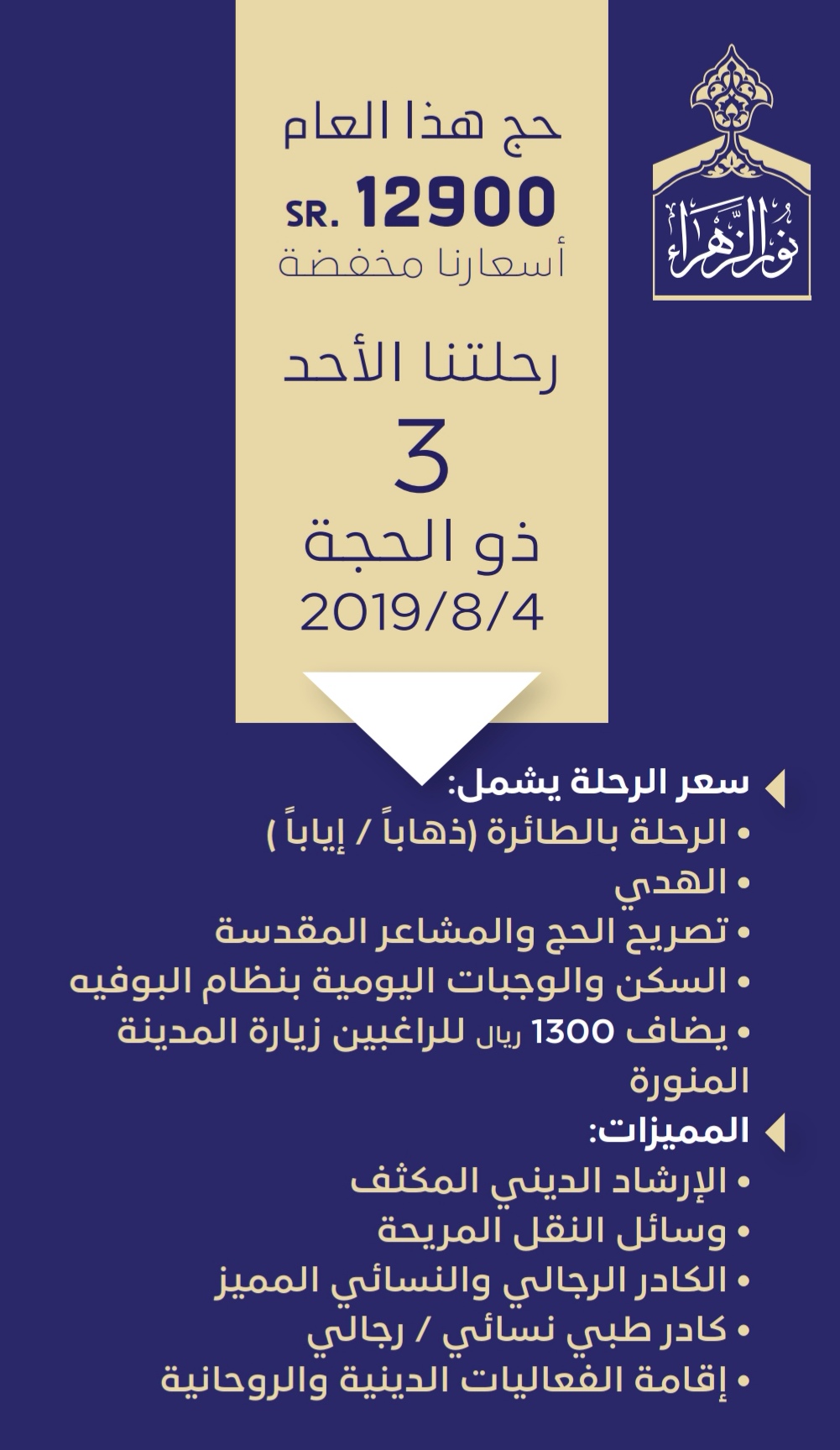 يسعدنا ويشرفنا اختياركم لحملة نور الزهراء لأداء فريضتكم العبادية، ونضع بين أيديكم برنامج الحج لعام 1440..