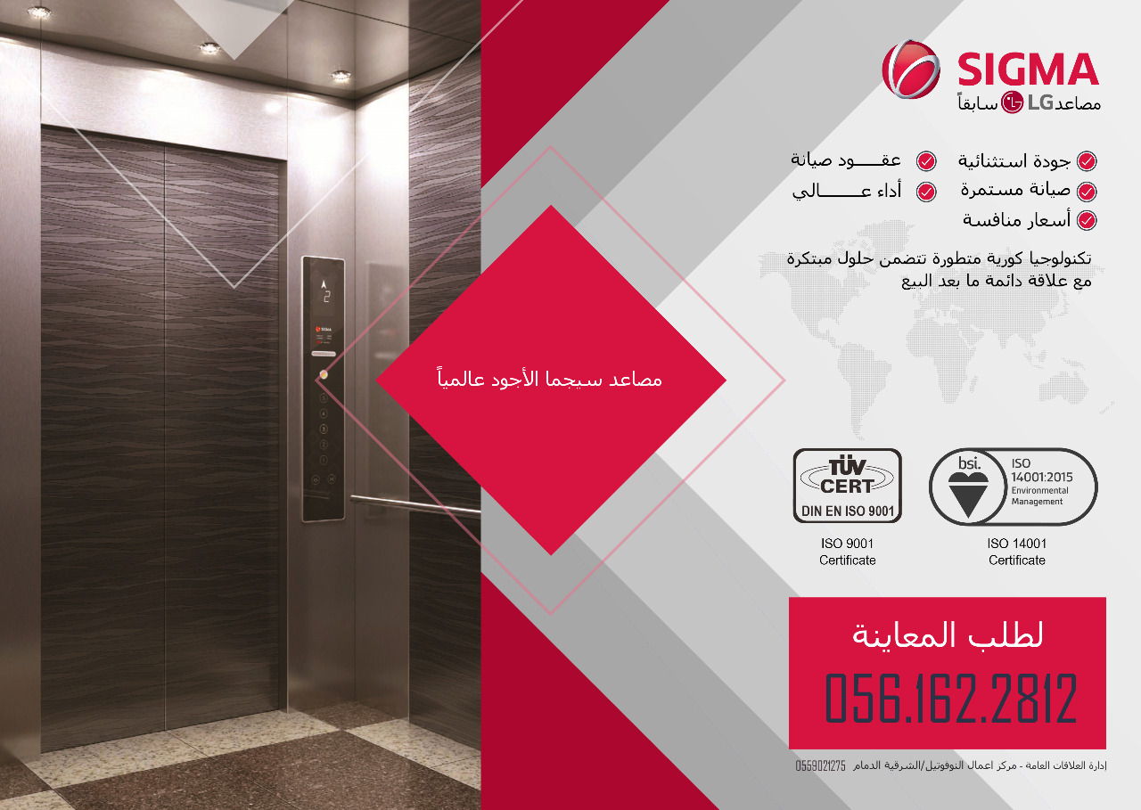 مصاعد وسلالم كهربائية من شركة سيجما ”ال جي“ الأجود والأكثر أمانًا عالميًا للمشاريع والأبراج والمنازل
