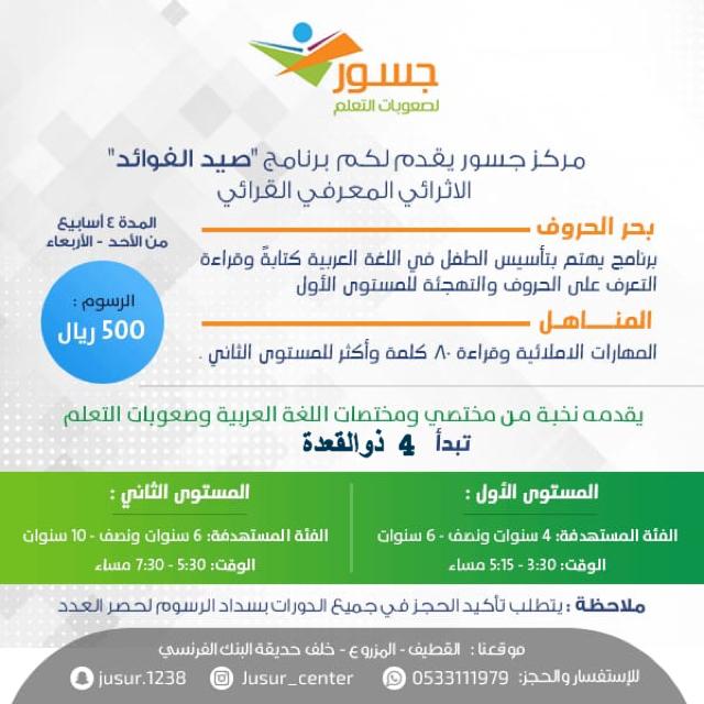 1️⃣ برنامج ”صيد االفوائد“ المعرفي الاثرائي القرائي، يهتم بتأسيس طفلك في اللغة العربية