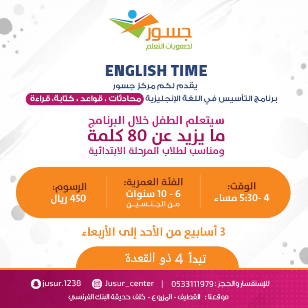 2️⃣ برنامج ”English Time“ التأسيسي في اللغة الانجليزية «محادثات، قراءة، كتابة، قواعد»، يناسب طلاب المرحلة الابتدائية..