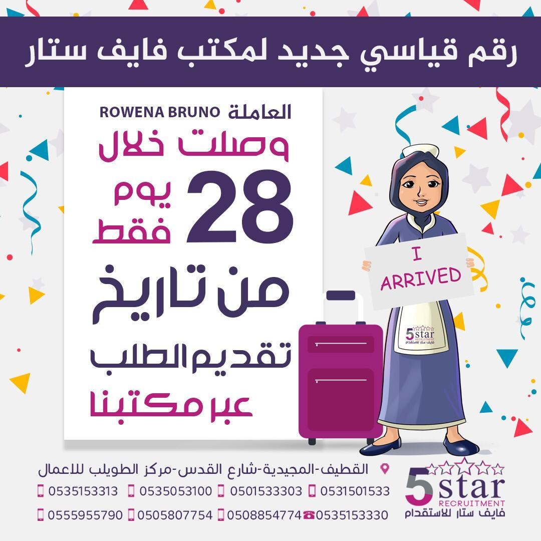 🧕 رقم قياسي جديد لمكتب فايف ستار للإستقدام وصول العاملة خلال 28 يوم فقط من تاريخ تقديم الطلب عبر مكتبنا👌