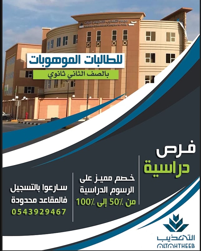 خصم مميز على الرسوم الدراسية من 50% إلى 100 % ” للطالبات الموهوبات بالصف الثاني ثانوي “