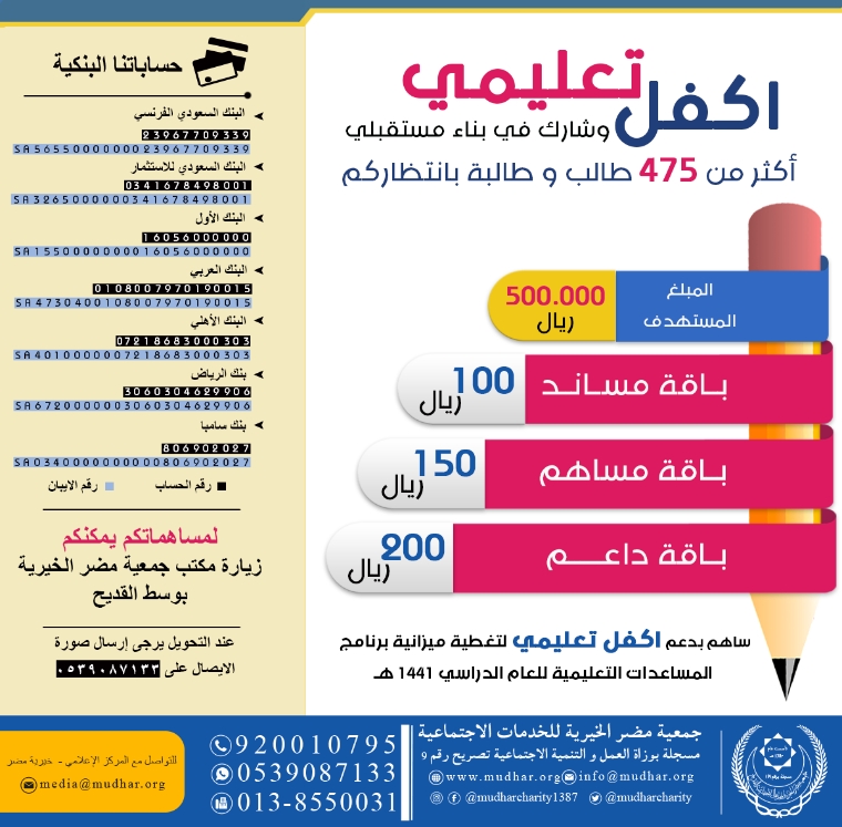 «اكفل تعليمي».. مبادرة سنوية تطلقها جمعية مضر لدعم الطلبة