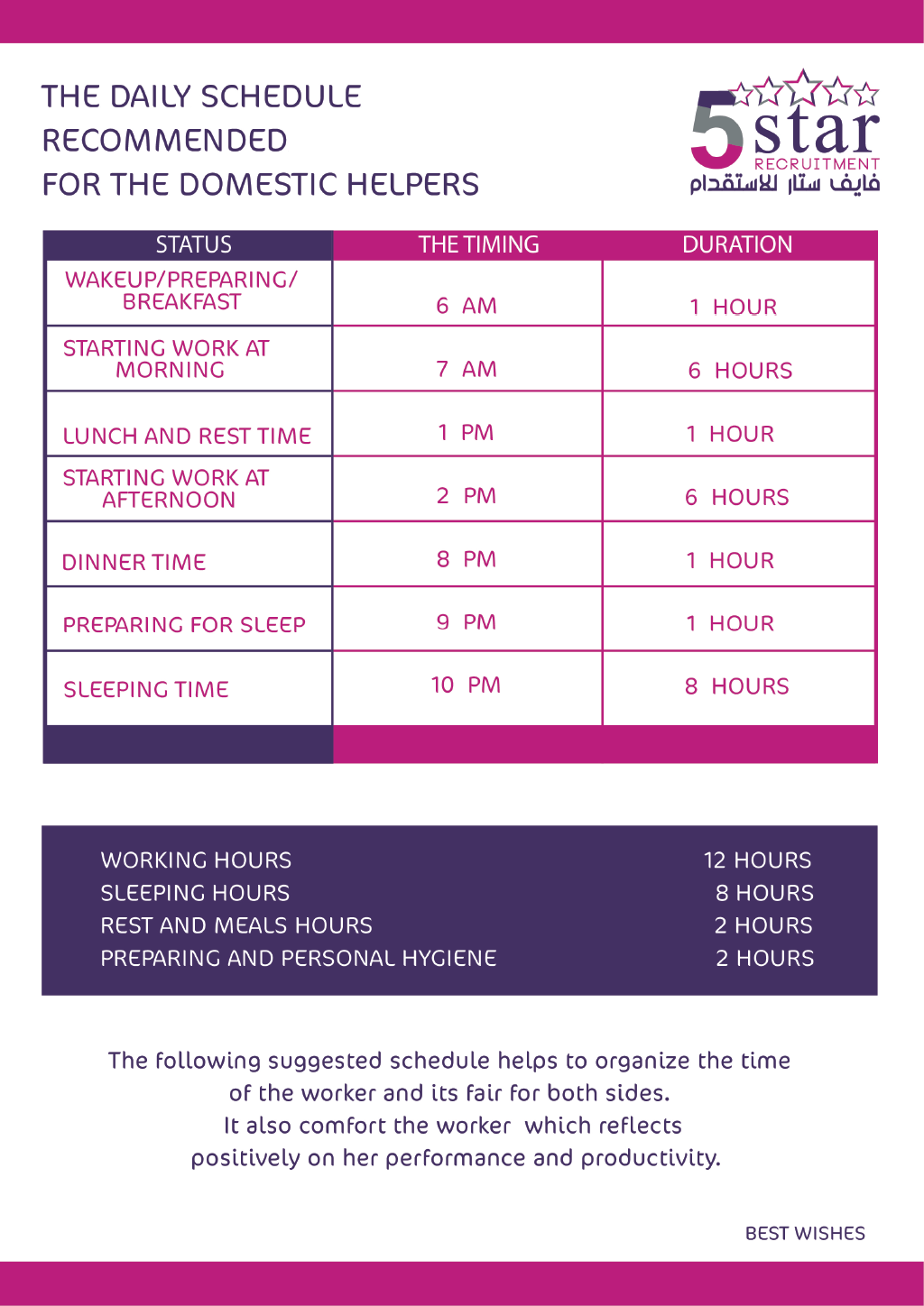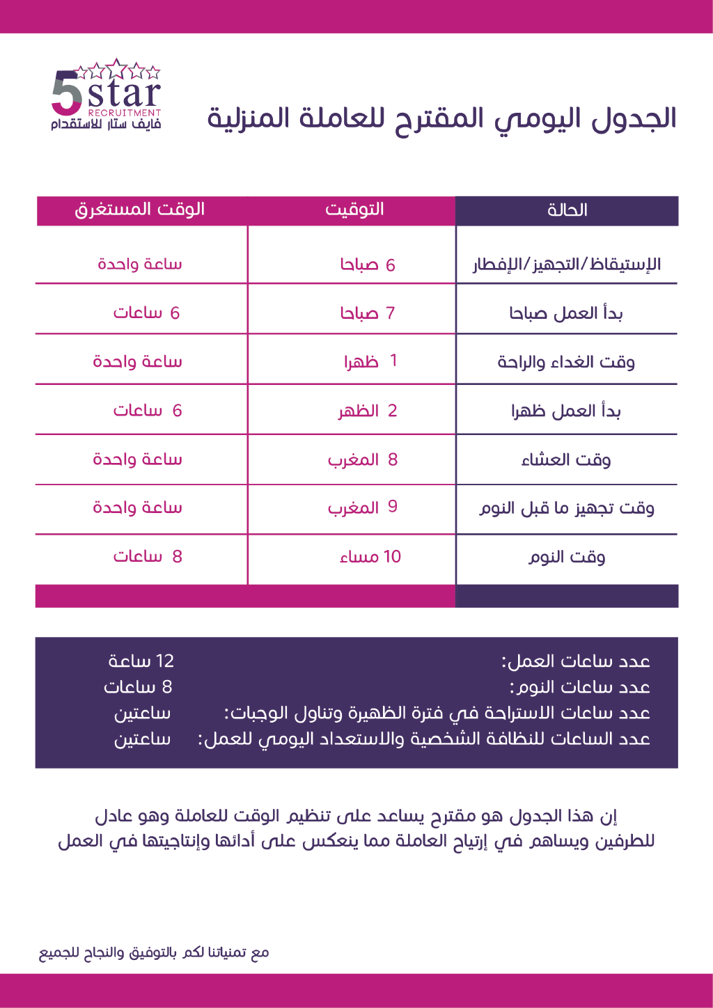 🌟⚡فايف ستار للاستقدام يهديكم جدول يومي مقترح للعمالة المنزلية يساعد في تنظيم الوقت للعاملة وهو عادل للطرفين ويساهم في إرتياح العاملة مما ينعكس على أدائها وإنتاجيتها في العمل⚡🌟