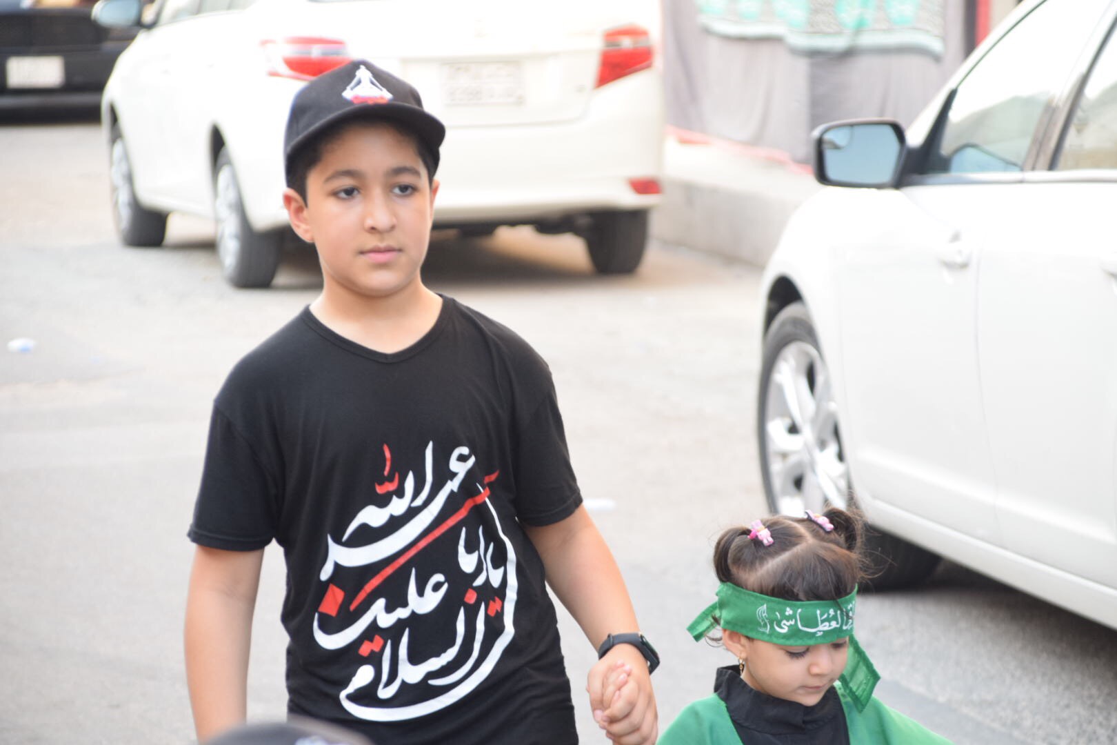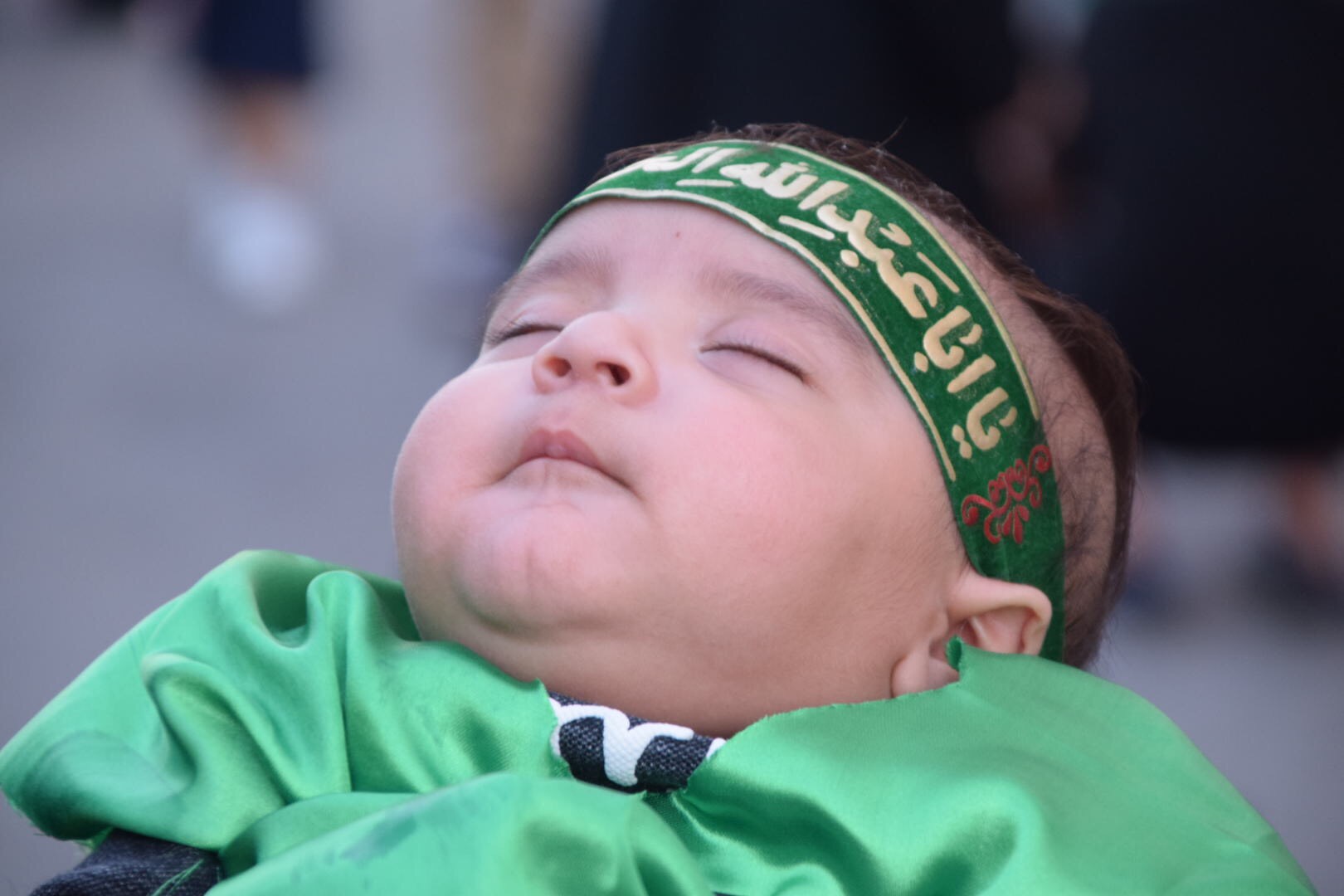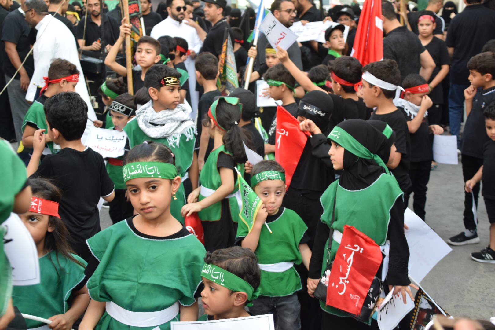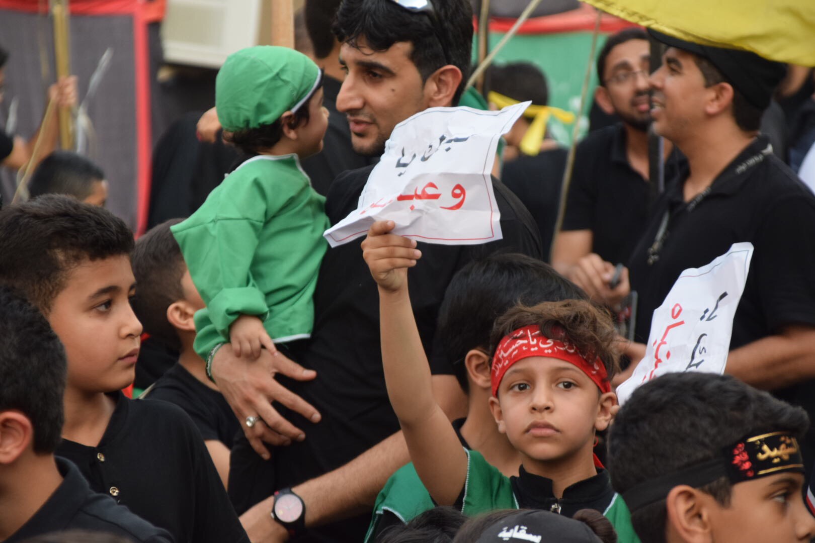 واتشح الأطفال في هذه المسيرة باللونين الأخضر والأحمر، وأخذوا يلوحون بباقات الريحان والأعلام وهم يهتفون بالتلبية للحسين ويجددون عهدهم مع الطفل الرضيع.