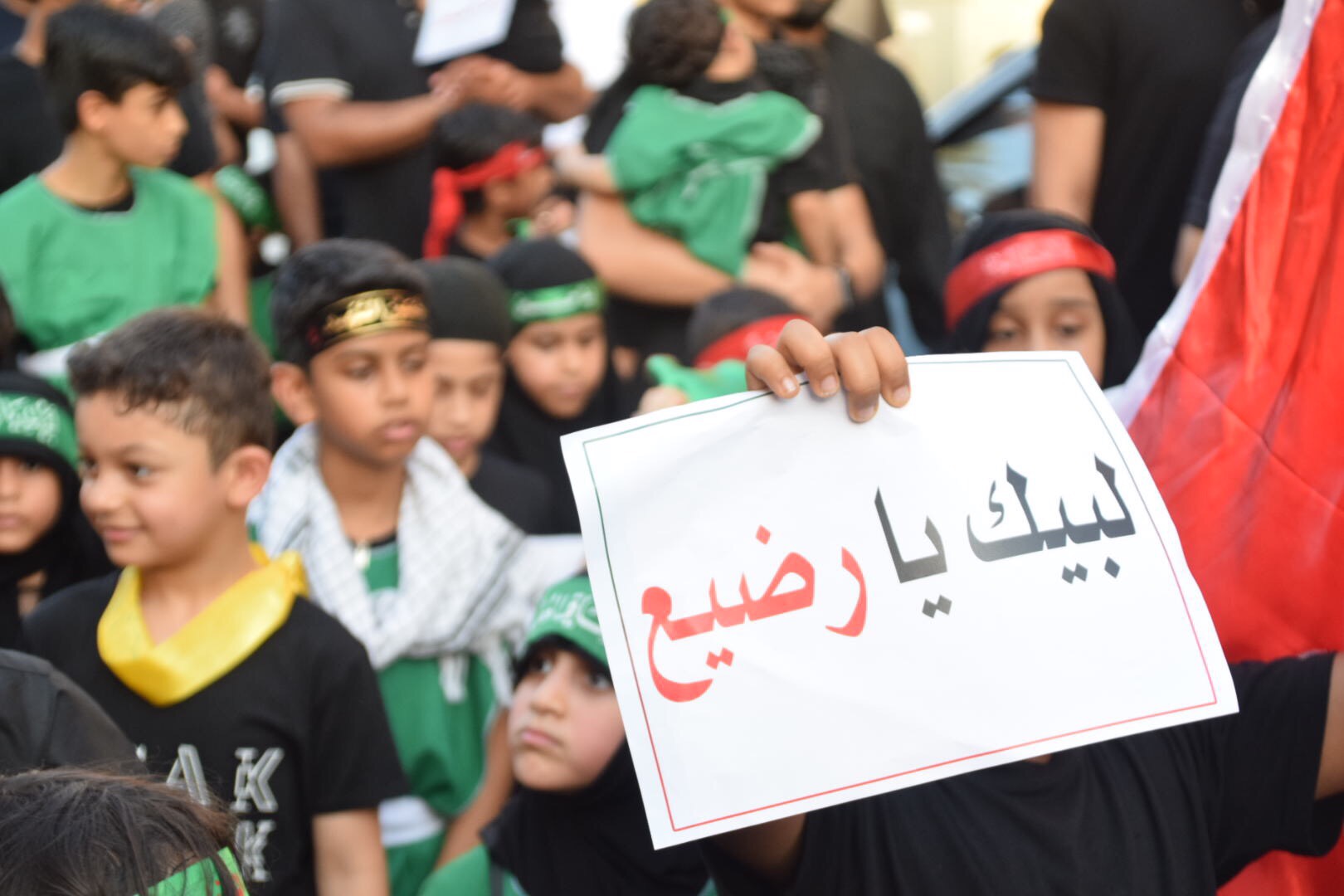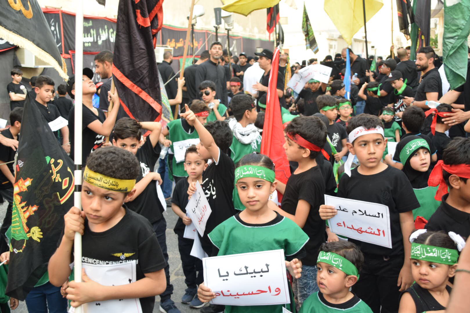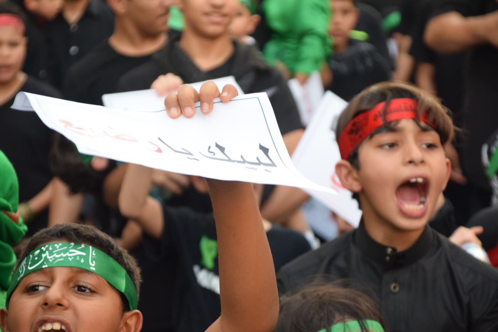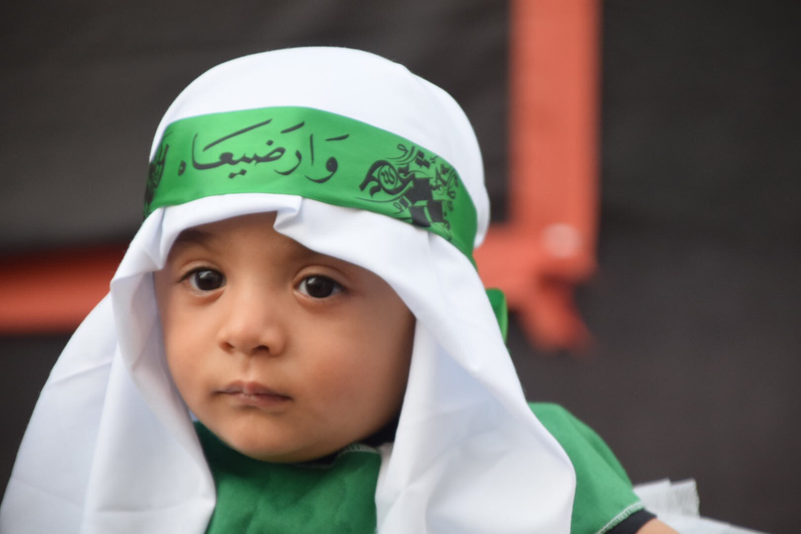 واتشح الأطفال في هذه المسيرة باللونين الأخضر والأحمر، وأخذوا يلوحون بباقات الريحان والأعلام وهم يهتفون بالتلبية للحسين ويجددون عهدهم مع الطفل الرضيع.