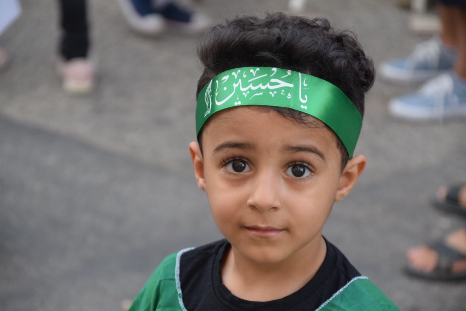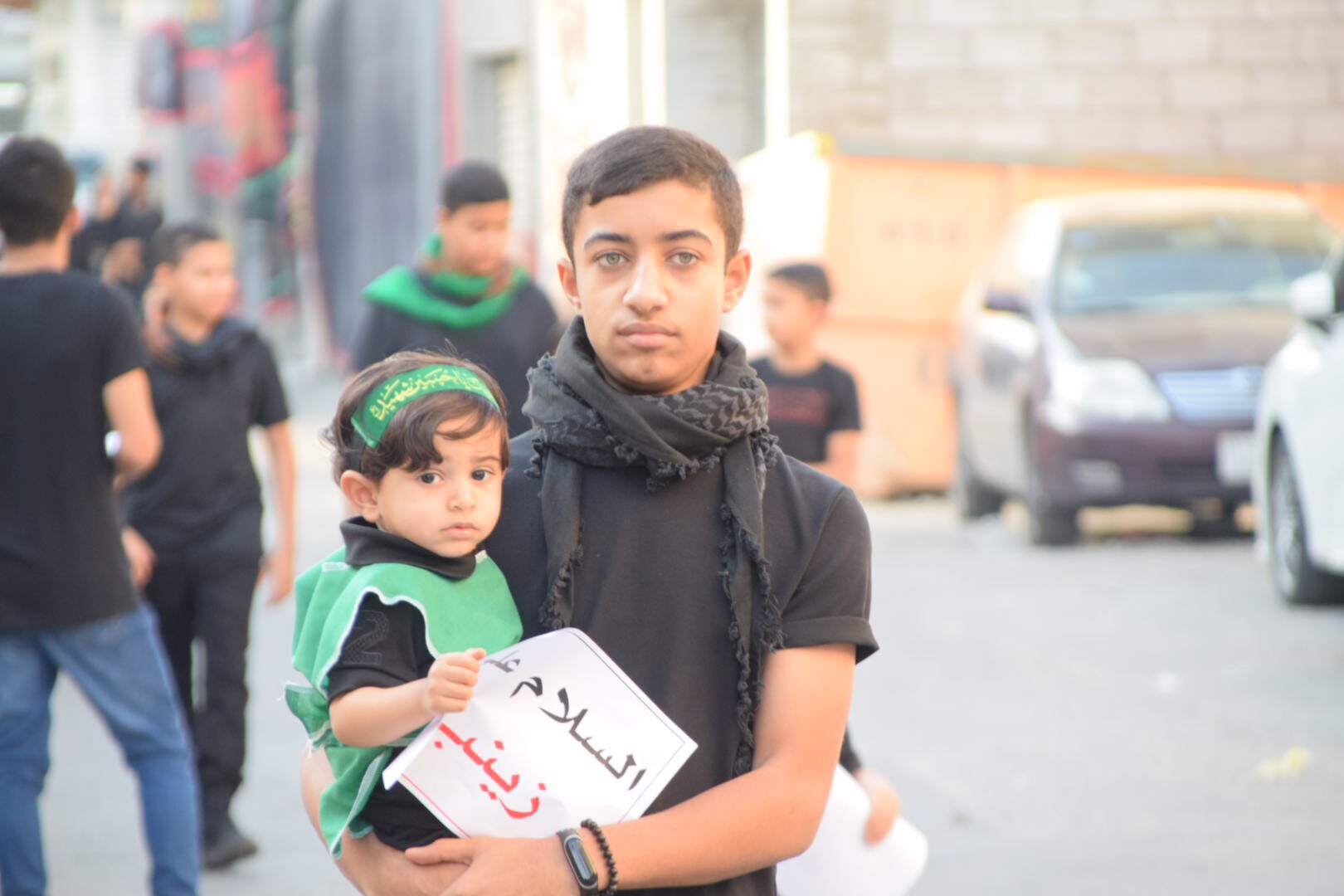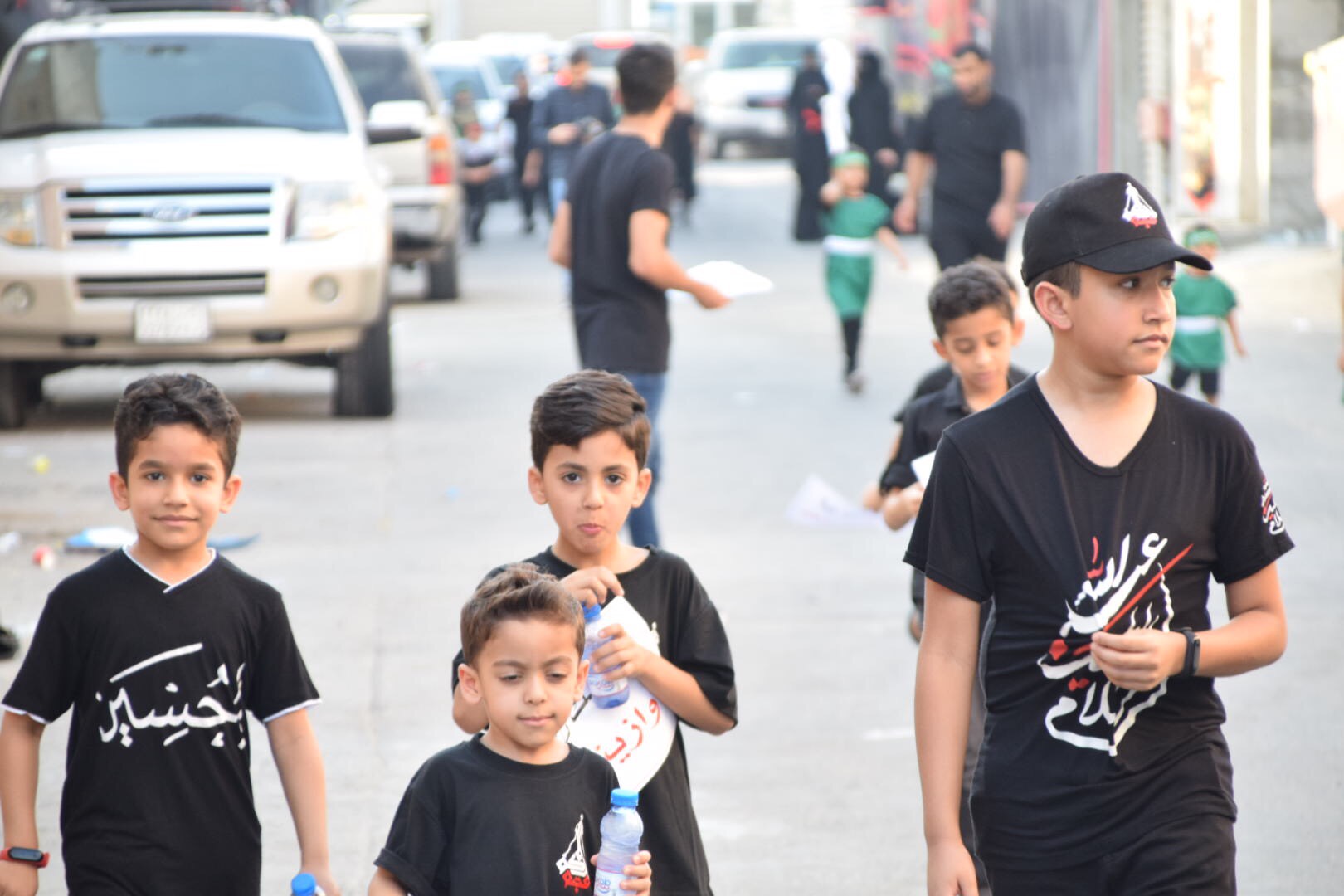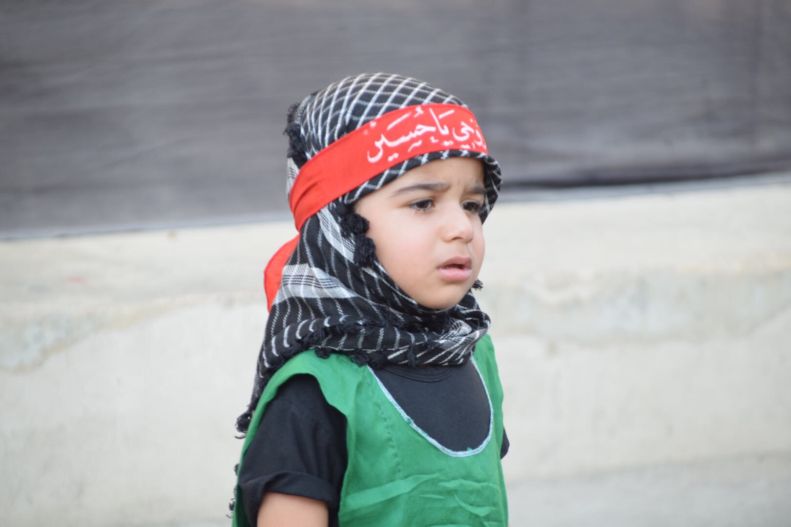 واتشح الأطفال في هذه المسيرة باللونين الأخضر والأحمر، وأخذوا يلوحون بباقات الريحان والأعلام وهم يهتفون بالتلبية للحسين ويجددون عهدهم مع الطفل الرضيع.
