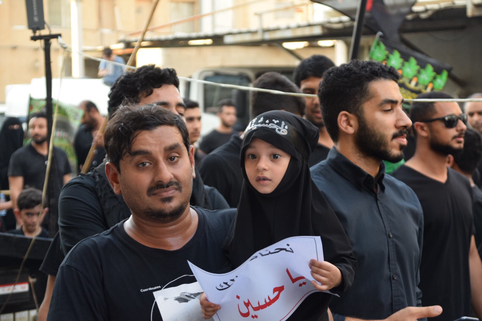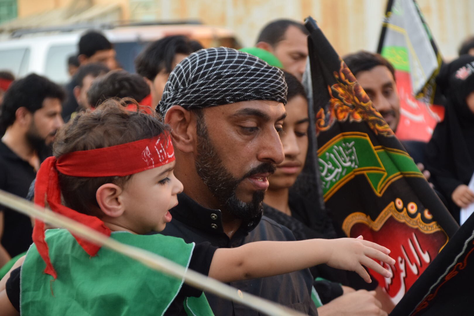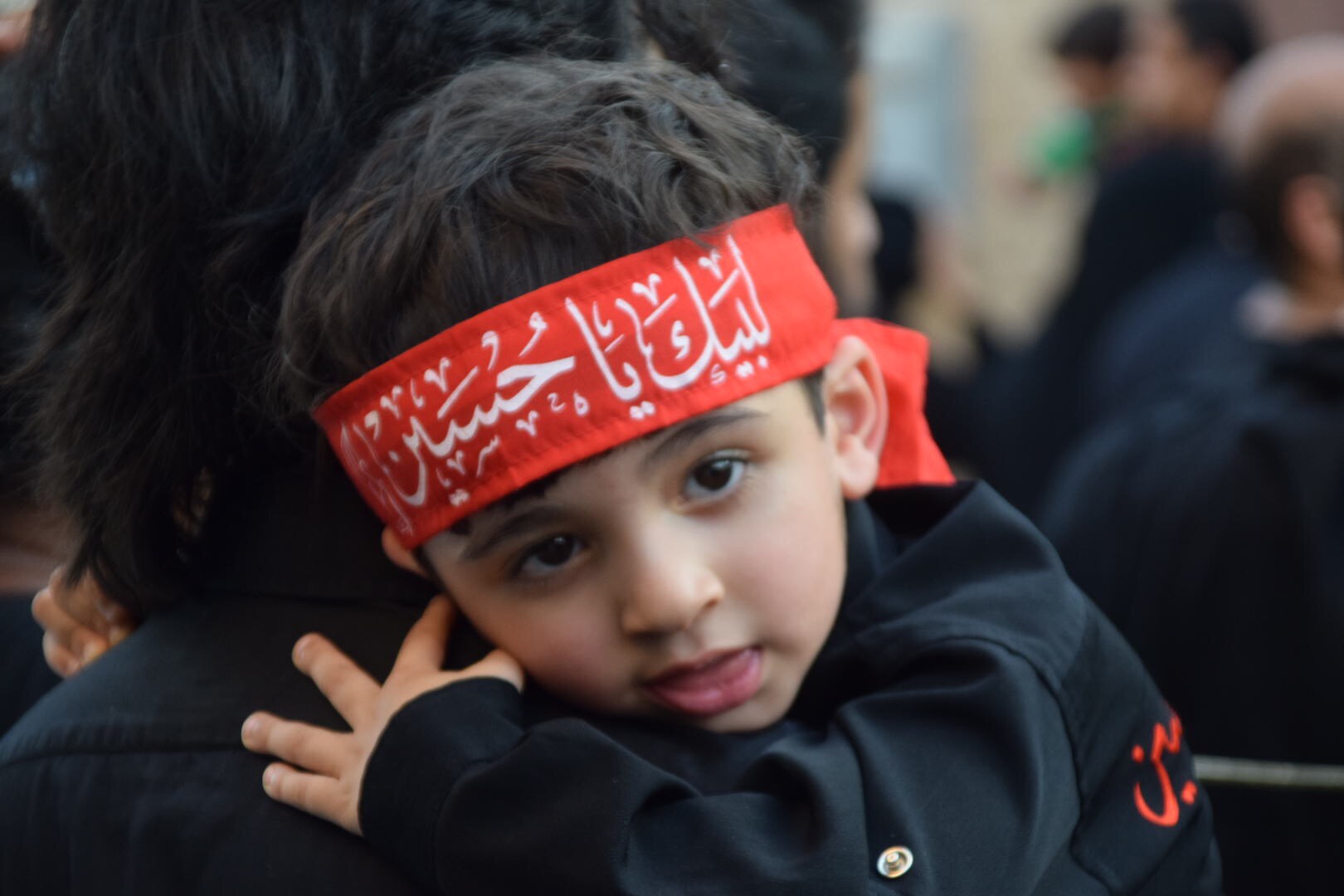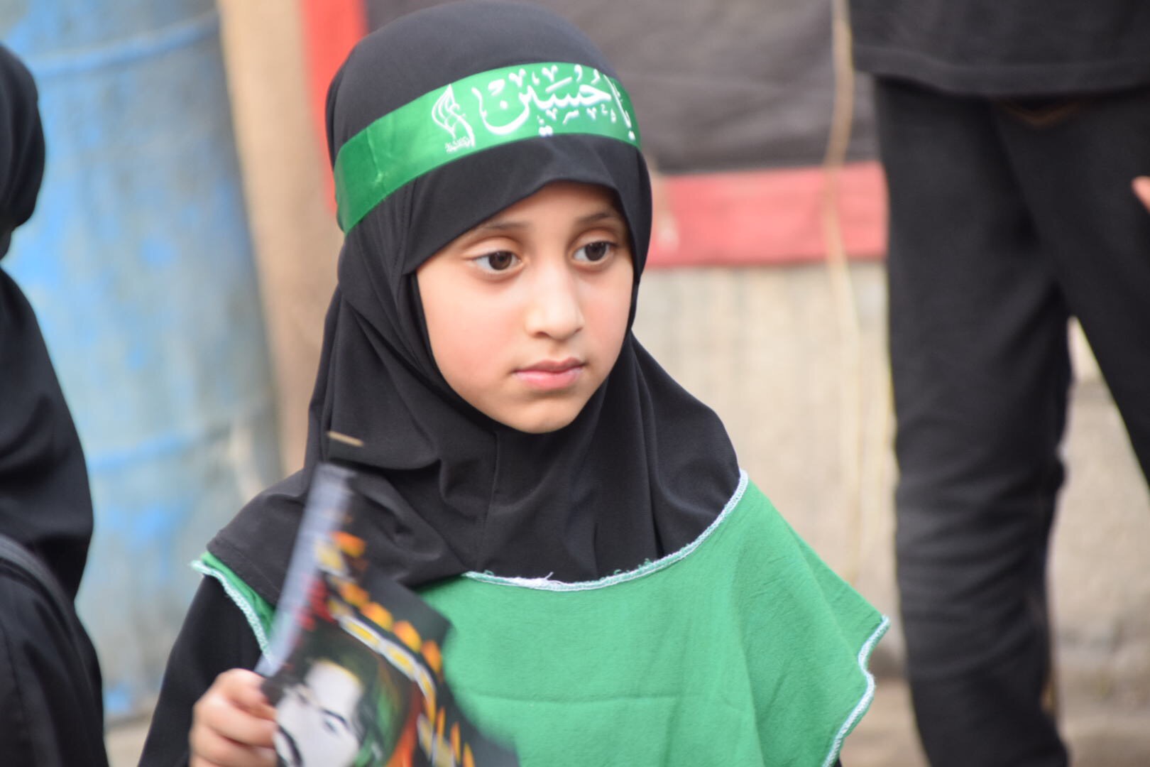 واتشح الأطفال في هذه المسيرة باللونين الأخضر والأحمر، وأخذوا يلوحون بباقات الريحان والأعلام وهم يهتفون بالتلبية للحسين ويجددون عهدهم مع الطفل الرضيع.