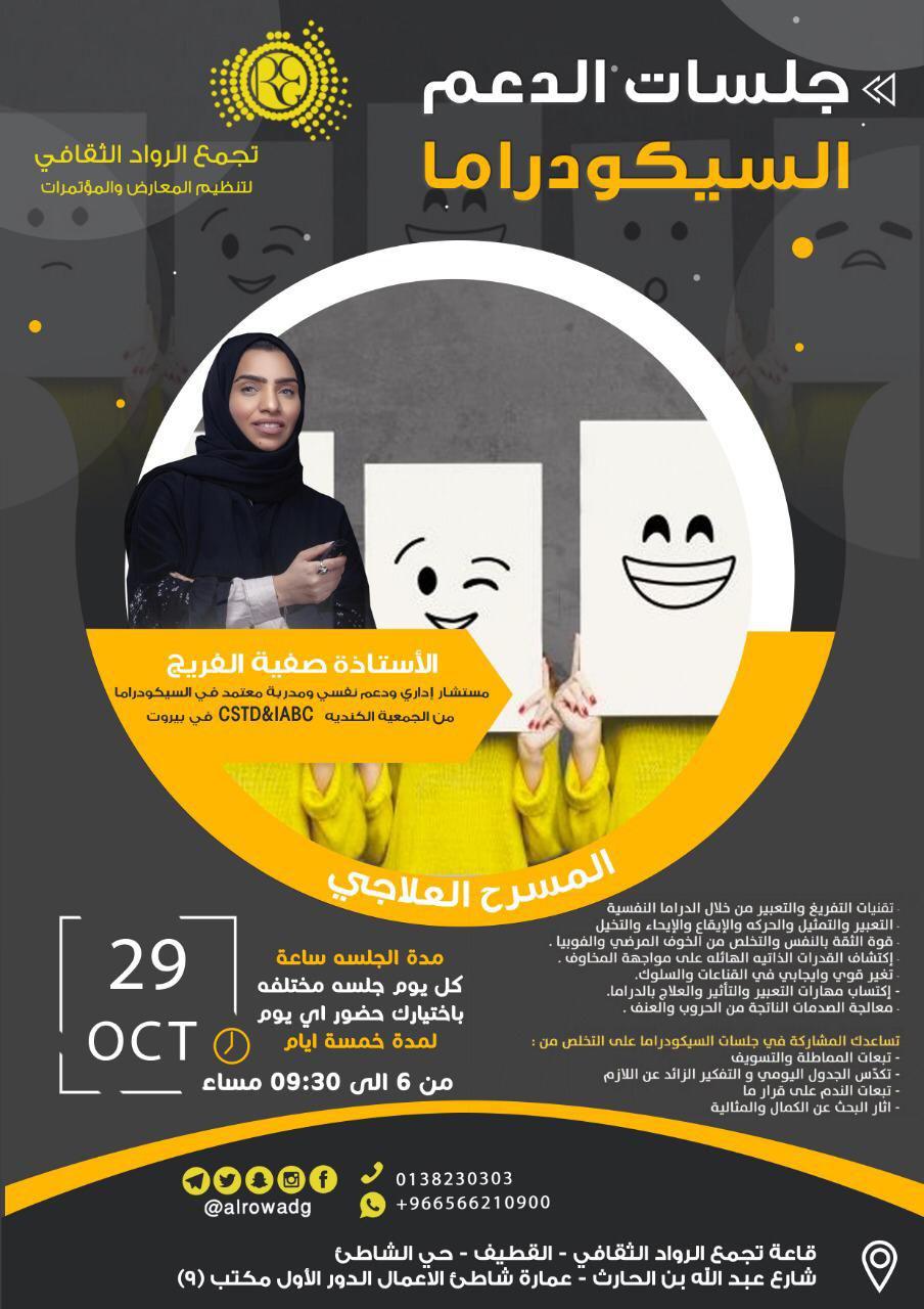 وتقدم الورشات صفية الفريج مستشار اداري ودعم نفسي ومدربة معتمدة في السيكودراما من الجمعية الكندية.
