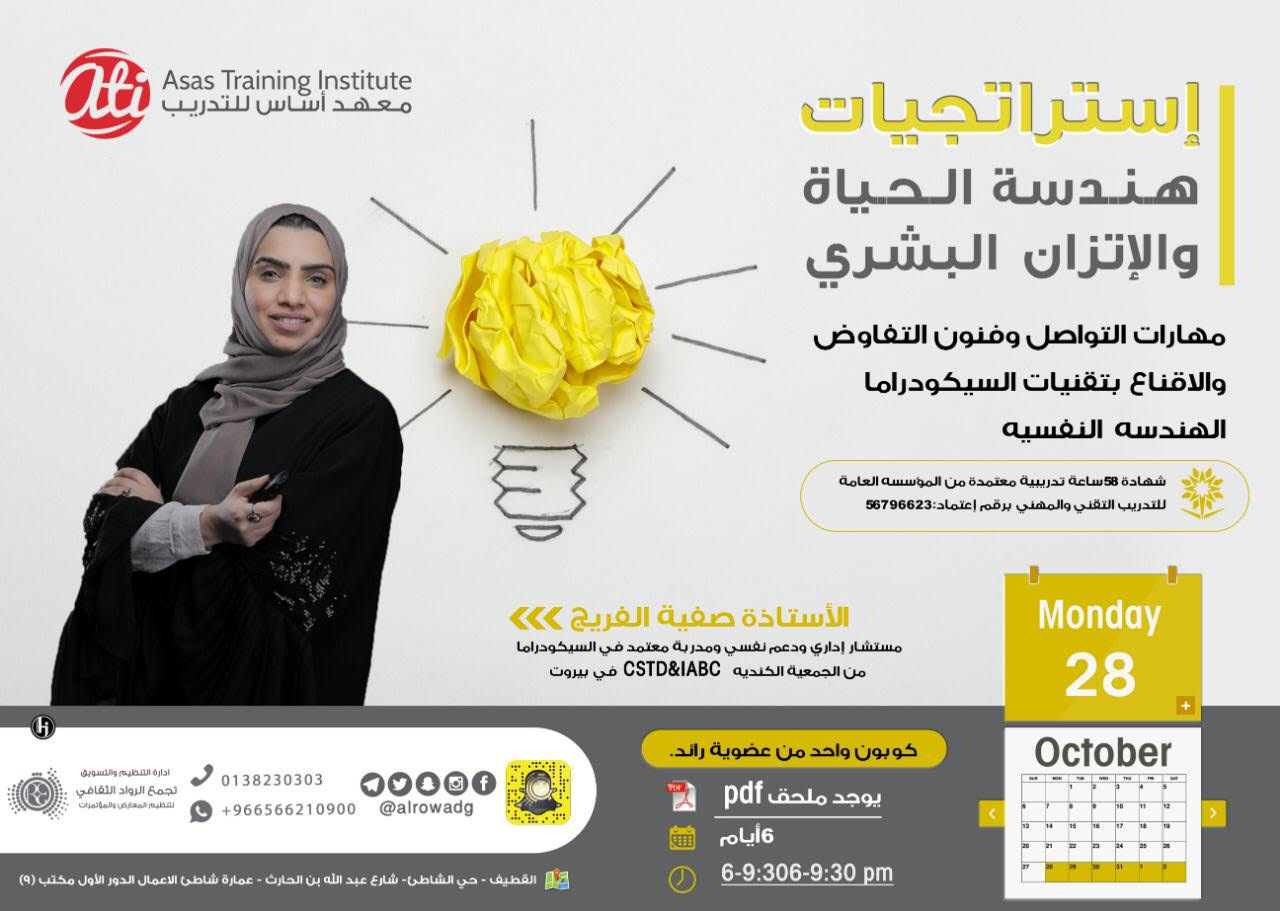 وتعد ورشة ”الهندسة النفسية“ من أقوى البرامج التدريبية التي اقيمت في القطيف في مهارات التواصل وفنون التفاوض والاقناع، حيث يدرب العقل البشري على كيفية عمله وتحقيق نتائج ثابتة في فهم الآخرين والتعامل بمنهجية واضحة، والأسلوب الأمثل للاتصال وكيفية تحديد الأهداف المستقبلية.