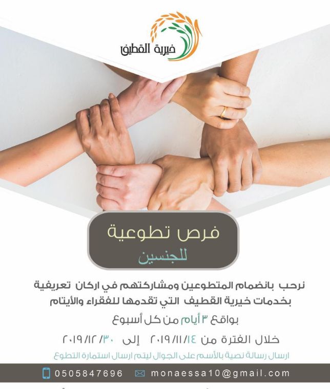 تعلن جمعية القطيف الخيرية عن فرص تطوعية للجنسين للانضمام والمشاركة في أركان تعريفية بخدمات الخيرية التي تقدمها للفقراء والأيتام بواقع 3 أيام من كل أسبوع.