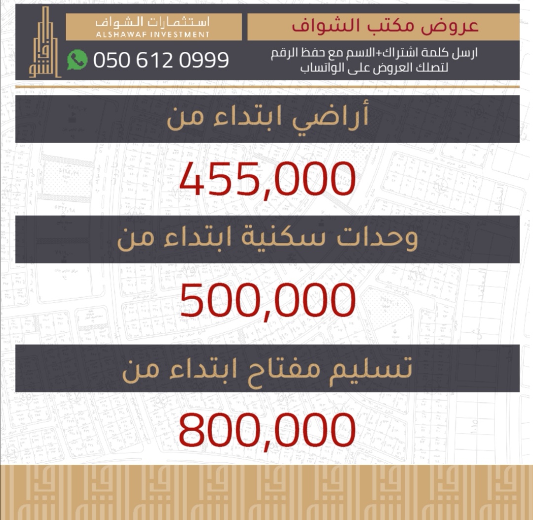 مكتب الشواف العقاري: أراضي ابتداء من 455 ألف، وحدات سكنية ابتداء من 500 ألف