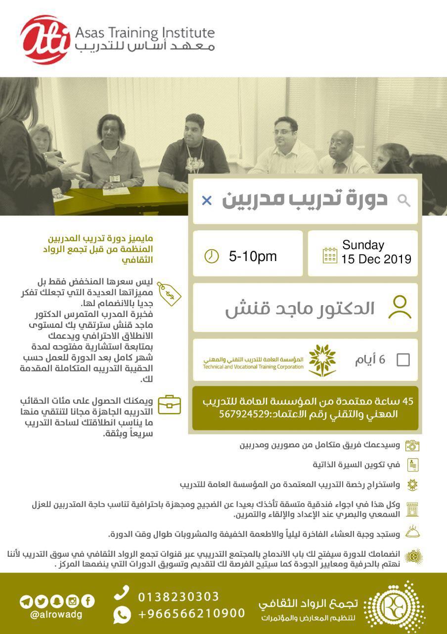 ”تدريب المدربين“ في تجمع الرواد الثقافي وبالتعاون مع معهد اساس للتدريب هي الوحيدة التي ستمنحك المئات من الحقائب التدريبية الجاهزة لتنتقي منها مايتناسب ساحة التدريب وبانطلاقة سريعة..