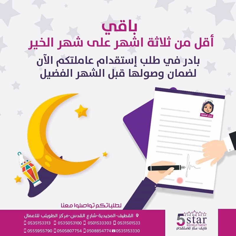 عشان تضمن وصول عاملتك قبل شهر رمضان.. اطلبها الآن من ”فايف ستار“