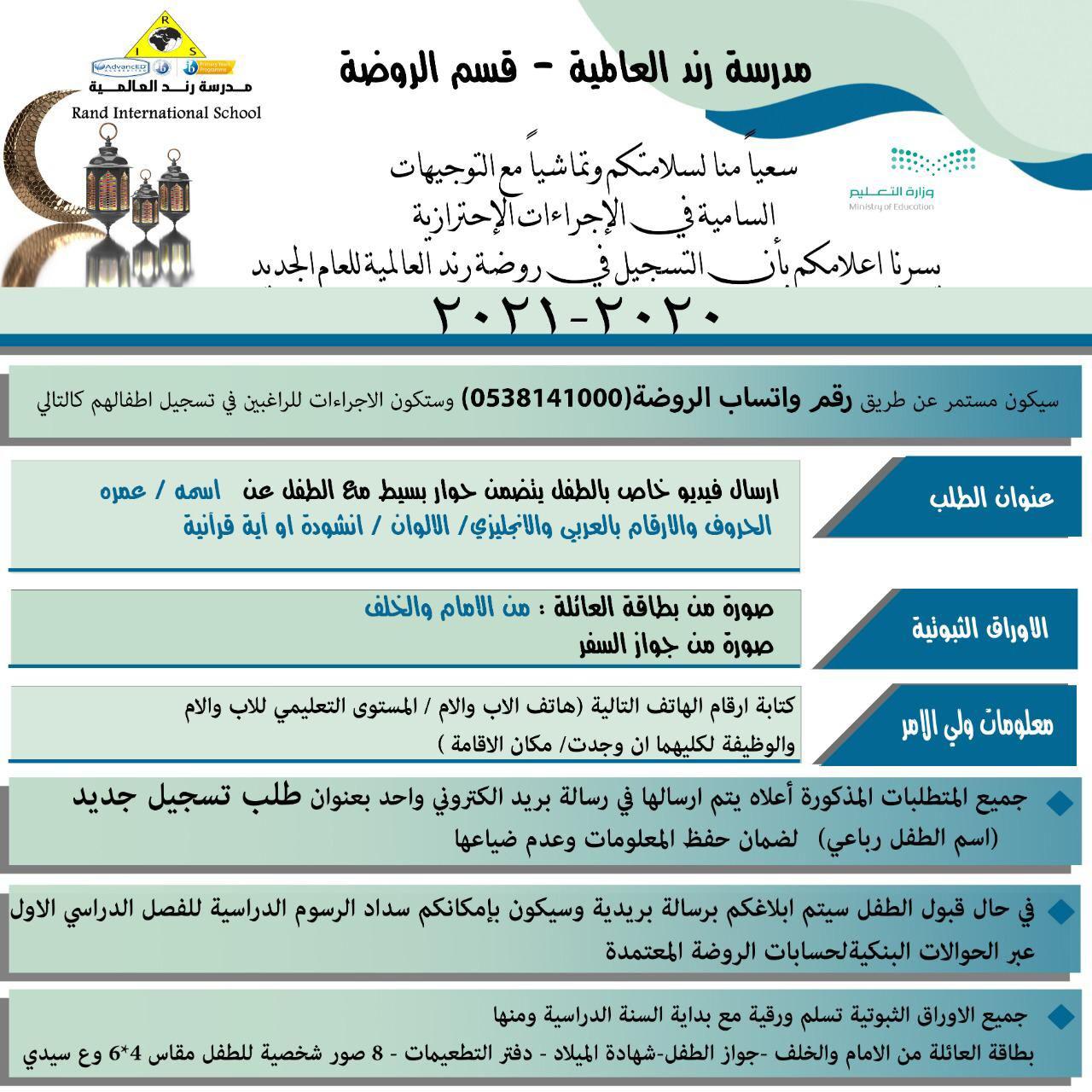 📌يسرنا الإعلان عن استمرار التسجيل في مدارس رند «الابتدائية الأهلية» و«الروضة العالمية» 📍