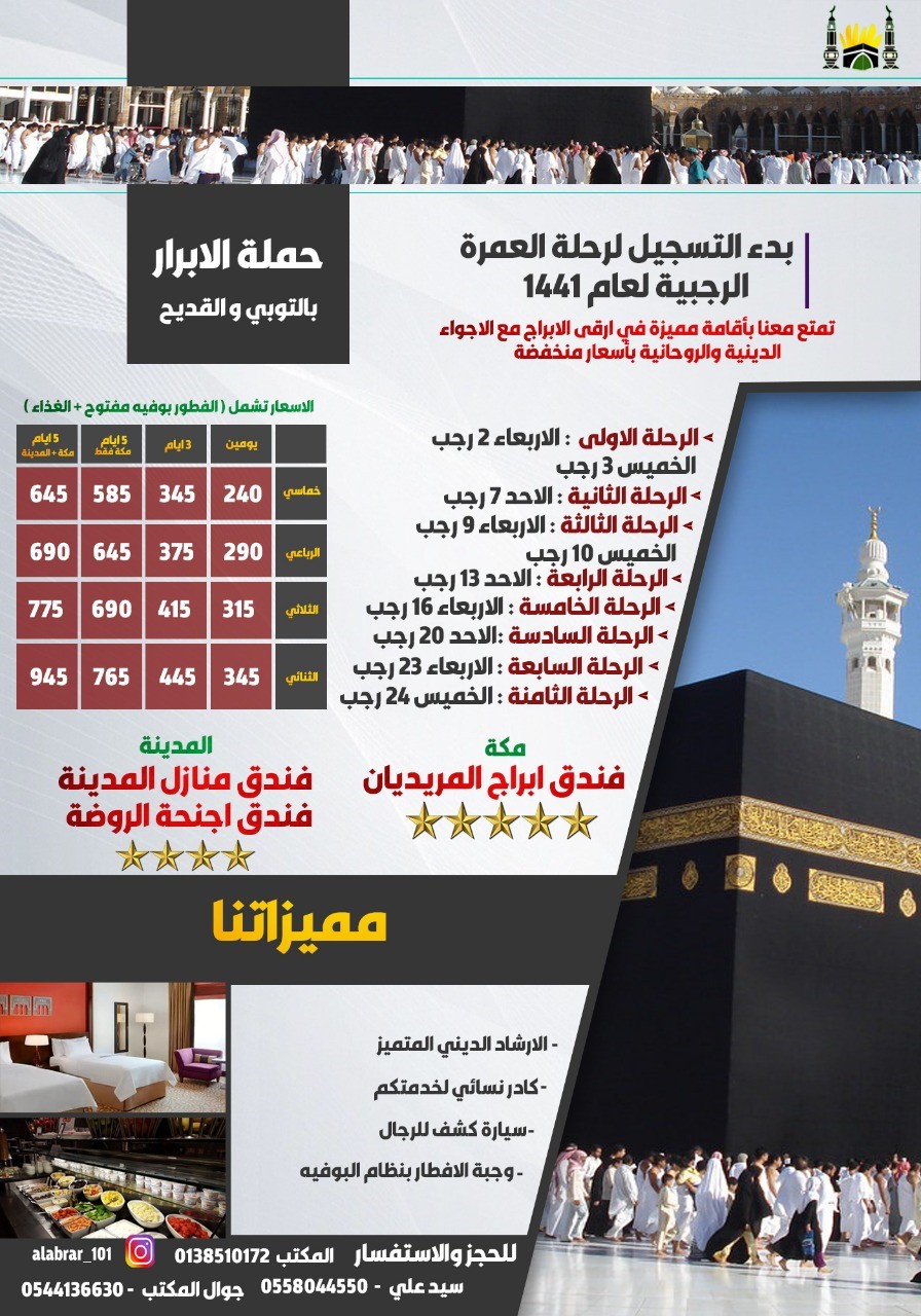 ريح بالك الفطور بوفيه والغذاء جاهز في رحلات العمرة الرجبية.. مع حملة الأبرار