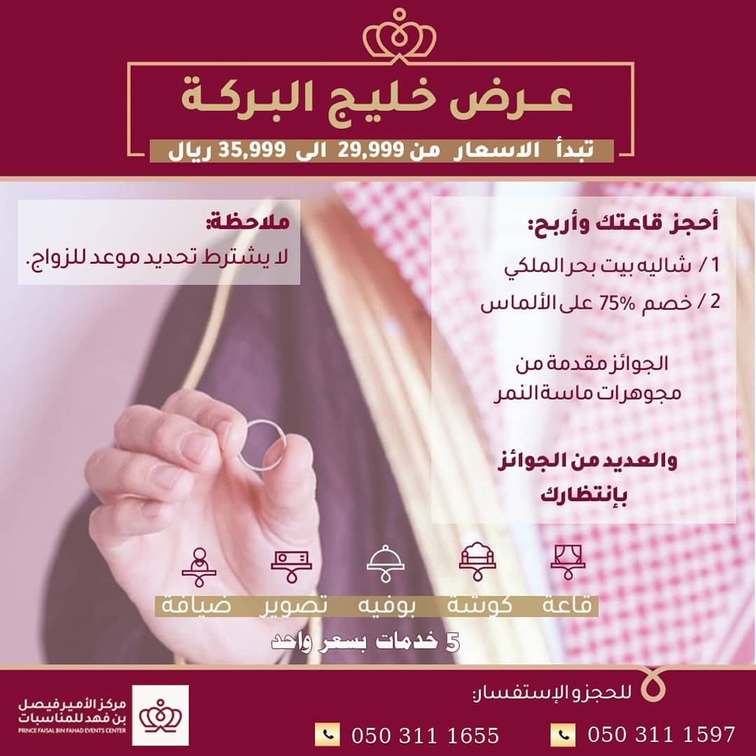 بعد أسبوعين من عرضه الاستثنائي؛ لم يكتفِ مركز الامير فيصل بن فهد للمناسبات بعرض صالات المناسبات الملكية بأسعار تبدأ من 29,999 لخمس خدمات تشمل: