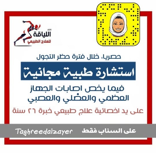 وتتعلق الاستشارات بإصابات الجهاز العظمي والعضلي والعصبي، تقدمها أخصائية العلاج الطبيعي تغريد الزاير، بخبرة 26 سنة.