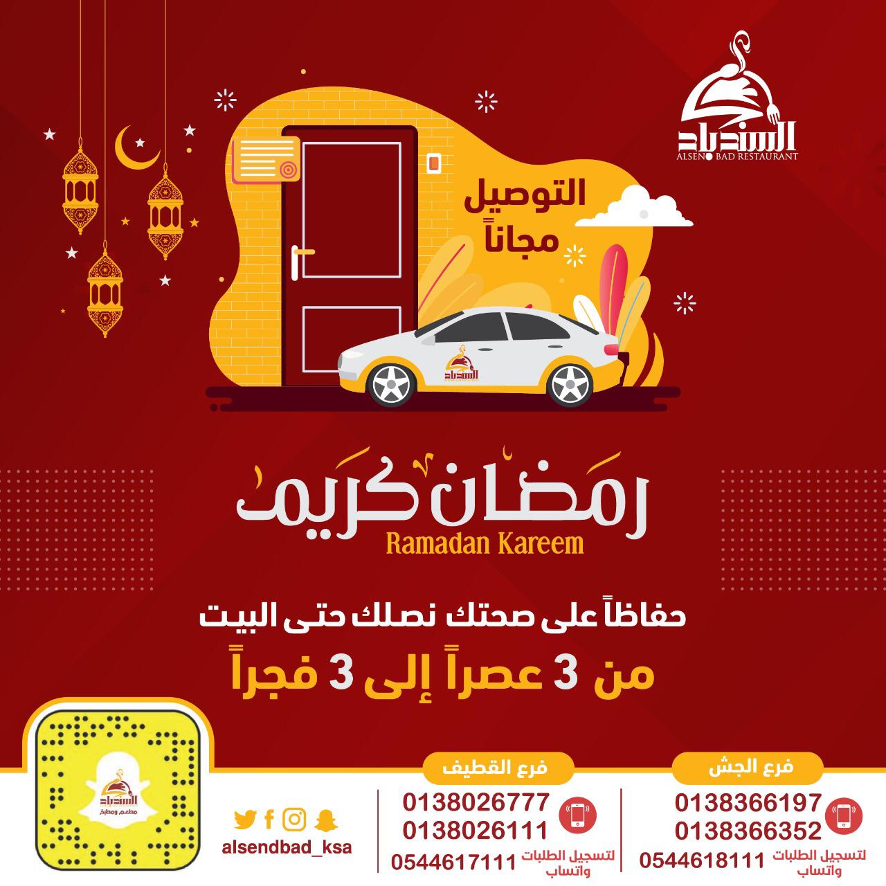 ومطعـم ومطبــخ السندبــاد يوصل لك وجبتي الإفطار والسحور لباب البيت مجانا