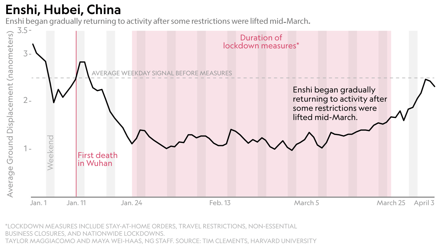 عالم جيولوجي «Thomas Lecocq» من بلجيكا، مختص برصد هذه الاهتزازات «Seismologist»، قام من منزله في بروكسل في بداية شهر أبريل الماضي وقت الحظر برصد وتحليل هذه الاهتزازات، كما قام غيره من المختصين في دول أخرى مثل سويسرا، أسبانيا، إيطاليا، بريطانيا، الصين، وغيرها. هؤلاء المختصون وجدوا أن نسبة هذه الاهتزازات قلَّت بفعل الحظر والتباعد الاجتماعي بنسبة كبيرة، على سبيل المثال 30 - 50% في بروكسل، وحوالي 80% في نيبال، «صورة أدناه لما حدث في الصين». هي المرة الأولى التي تحدث على نطاق عالمي ما يعطي هؤلاء العلماء فرصة لدراسة هذا الهدوء الكوني وهذه الظاهرة الغير مسبوقة.
