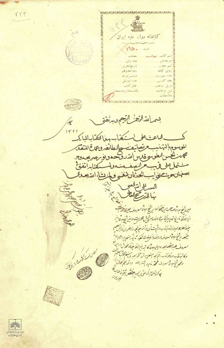 المصدر: المكتبة الوطنية في طهران، رقم المخطوط: 723 [13] .