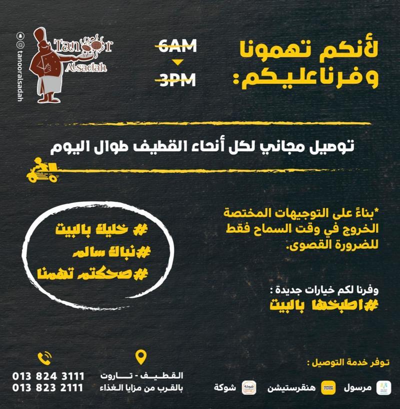 لأننا نهتم بكم.. ”تنور السادة“ يقدم لكم خدمة التوصيل المجانية لكل انحاء القطيف