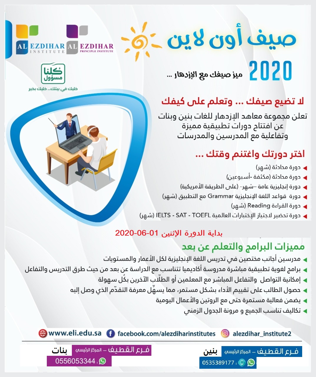 تعلن مجموعة معاهد الإزدهار للغات عن بدء دورات «صيف 2020» المتنوعة عن بُعد.