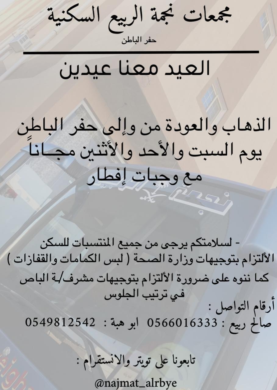 تعلن مجمعات نجمة الربيع السكنية عن الذهاب والعودة من وإلى حفر الباطن يوم السبت والأحد والأثنين مجانا مع وجبة الأفطار