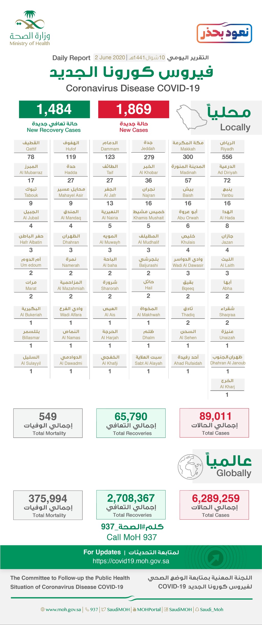 الصحة: تسجيل 1869 إصابة جديدة بكورونا منها 78 في القطيف