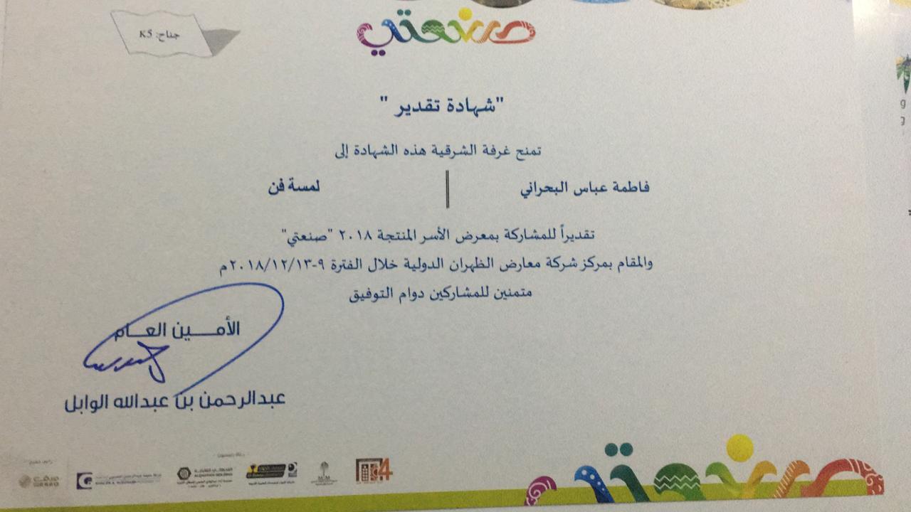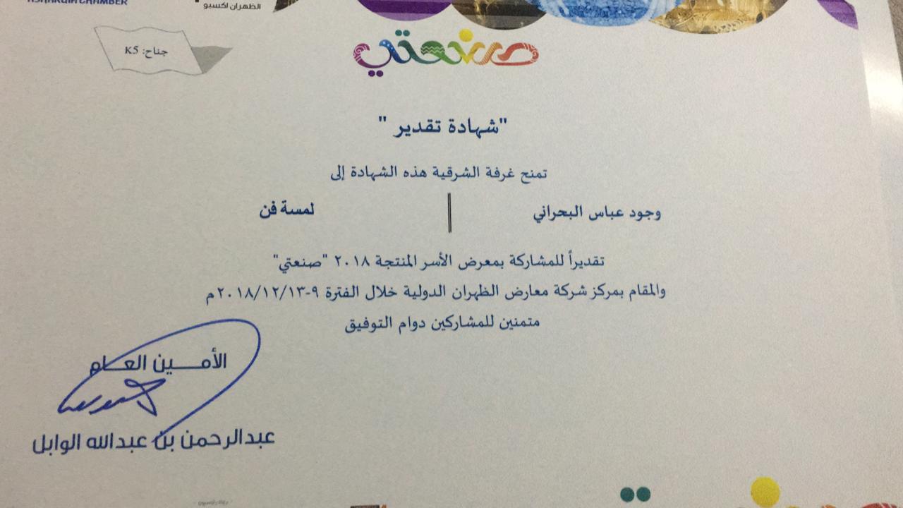 وذكرت بأن وجود التي تطمح بأن تكون رائده في مجال الديكوباج والأعمال الفنية شاركت في مهرجان الأسر المنتجة بمركز التنمية الاجتماعية بالقطيف قبل 4 سنوات كما شاركت في مهرجان صنعتي على مدى ثلاثة أعوام.