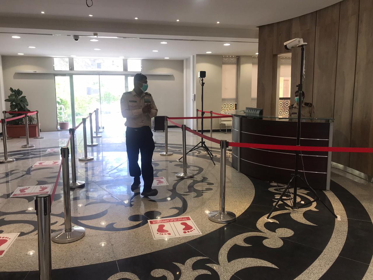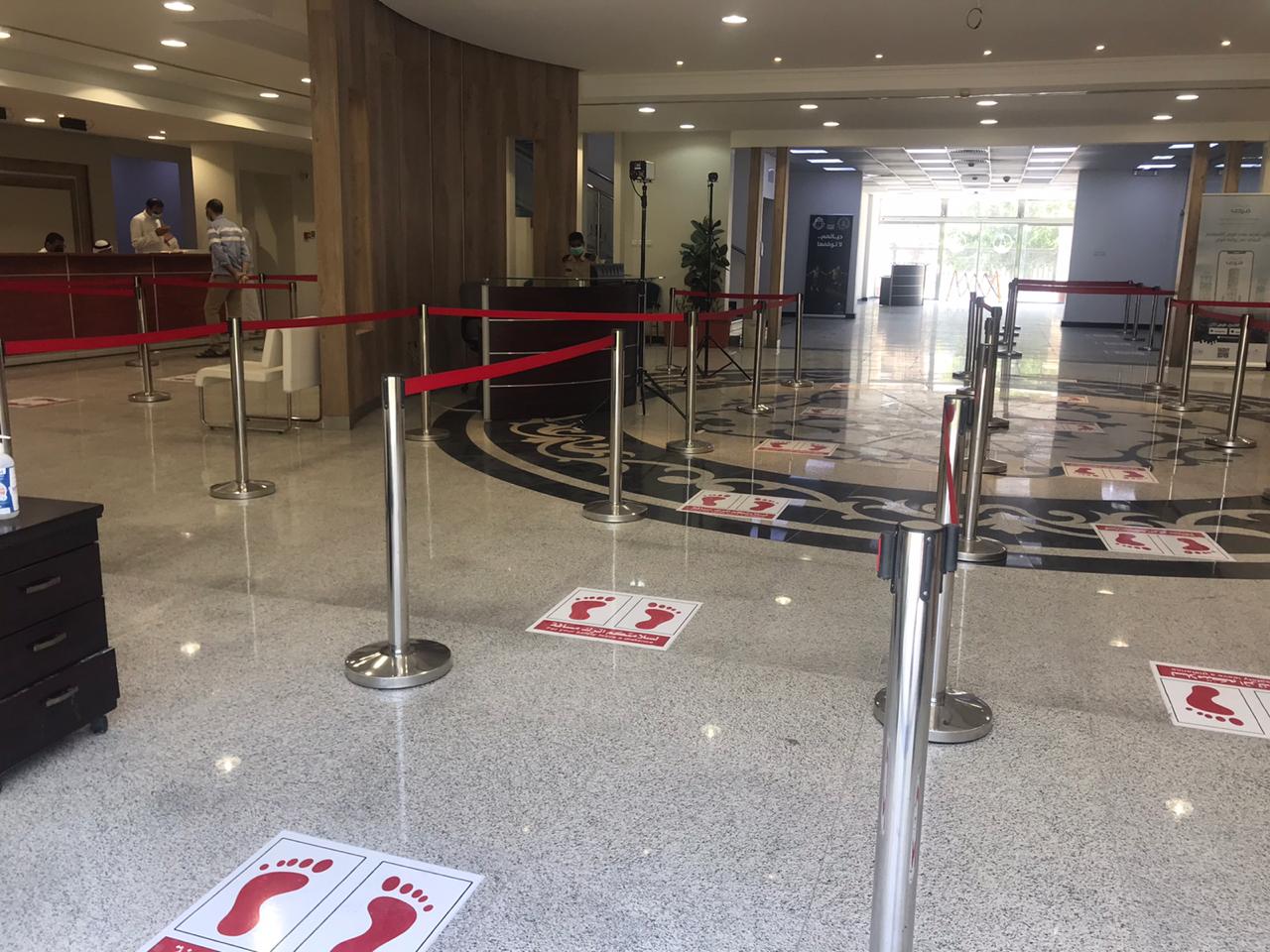 وأشار الى تطبيق الإجراءات الاحترازية ووضع الملصقات الإرشادية في قاعة الاستقبال وعند المدخل والمكاتب، والاهتمام بلبس القفاز والكمام والتباعد عند الجلوس أو الوقوف والحرص على تعقيم الأيدي وغسلها باستمرار أثناء العمل.