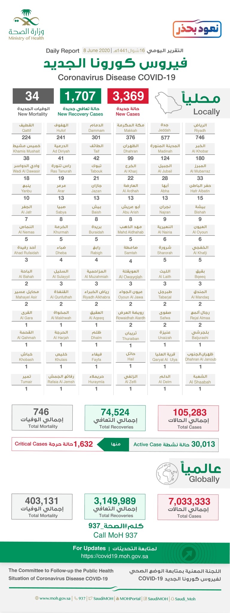 أعلنت وزارة الصحة، اليوم الاثنين، تسجيل 3369 إصابة جديدة بفيروس ”كورونا“ المستجد ”كوفيد - 19“ في المملكة. منها 224 في القطيف و2 بصفوى. ليرتفع إلى 105283 حالة مؤكدة.