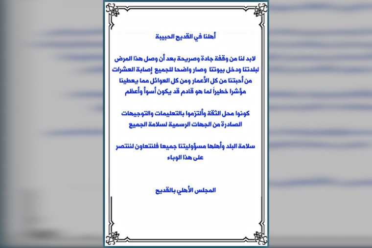 دعا المجلس الأهلي في بلدة القديح بمحافظة القطيف في رسالة للأهالي إلى اتخاذ وقفة جادة بعد انتشار جائحة كورونا المستجد في العشرات من الأهالي بحسب المجلس.