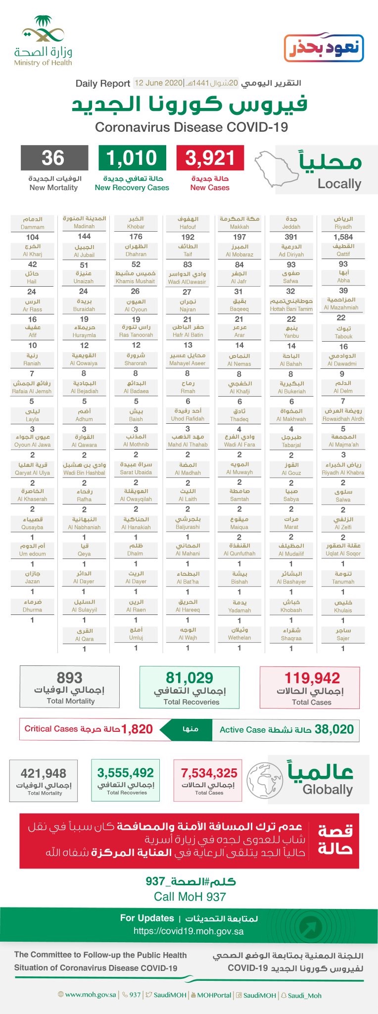 وبلغ إجمالي الحالات النشطة 38020 حالة، منها 1820حالة حرجة.