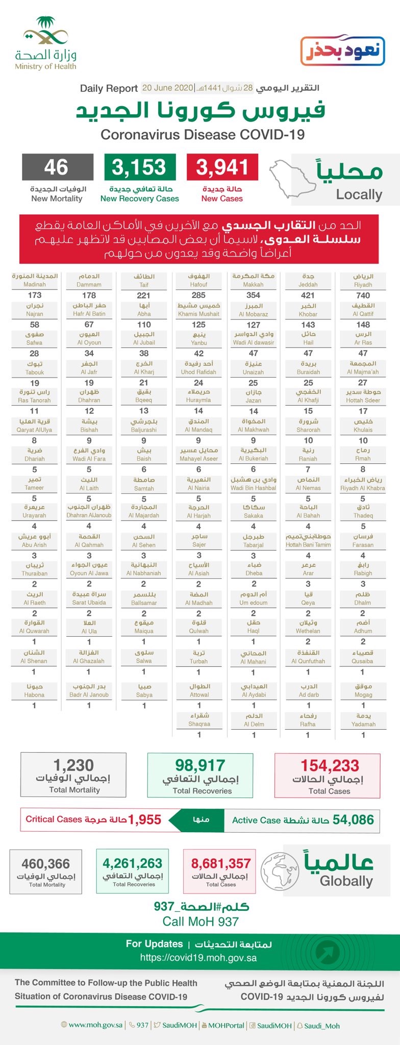 أعلنت وزارة الصحة، اليوم السبت، تسجيل 3941 إصابة جديدة بفيروس ”كورونا“ المستجد ”كوفيد - 19“ في المملكة. منها 148 في القطيف و28 بصفوى.
