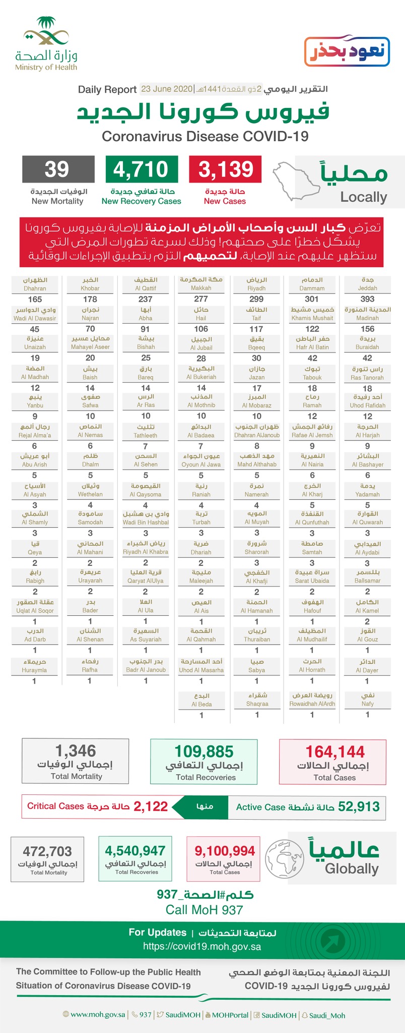 وبلغ إجمالي الحالات النشطة 52913 حالة، منها 2122 حالة حرجة.
