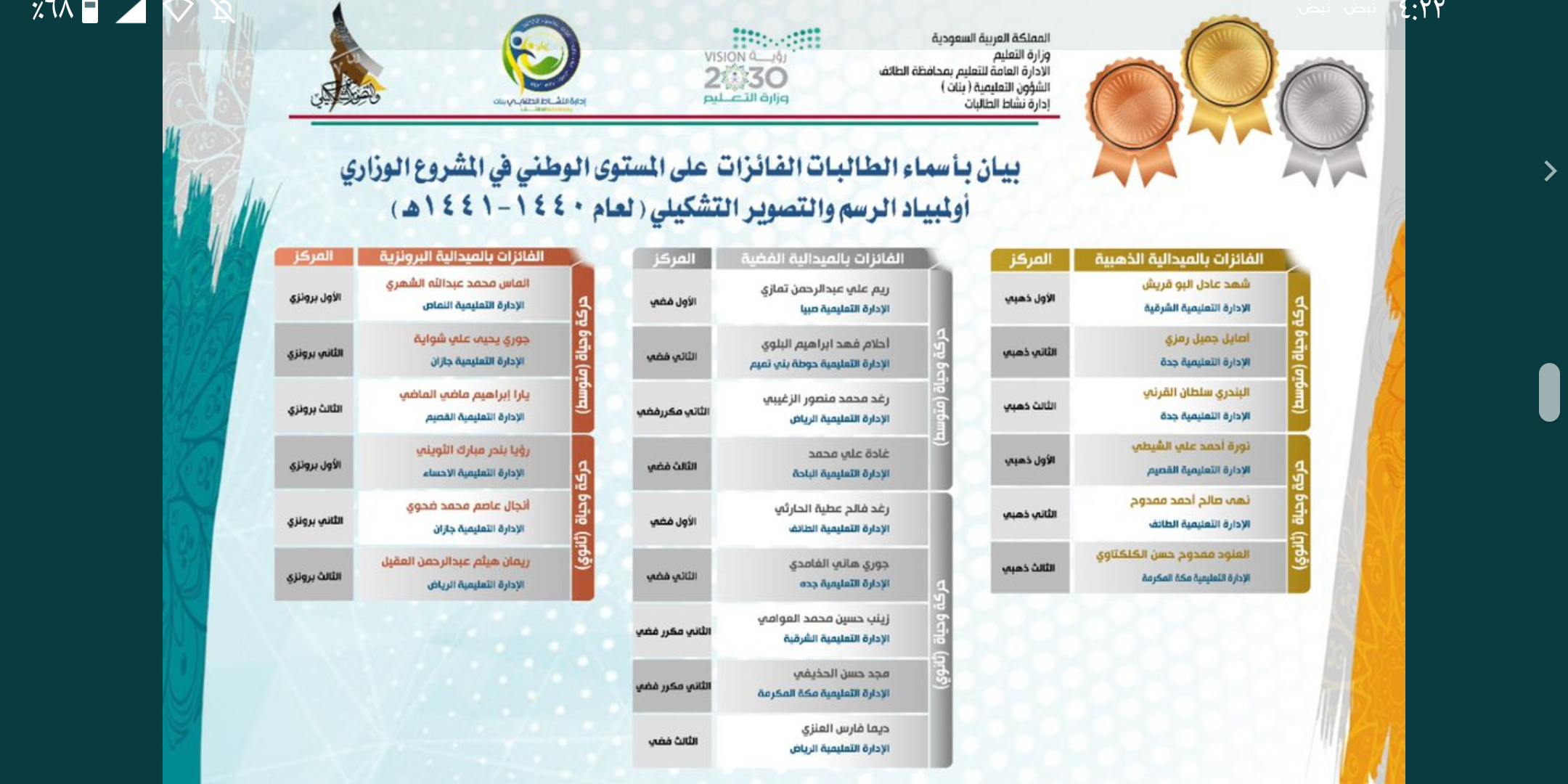يذكر أن إدارة تعليم الشرقية حصدت خمس ميداليات في المسابقة الوطنية وكان احداها نصيب تعليم القطيف متمثلة بالطالبة الموهوبة زينب العوامي.