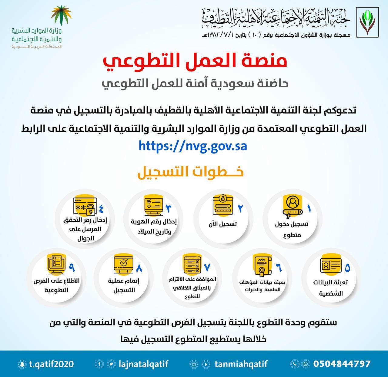 دعت لجنة التنمية الاجتماعية الأهلية بالقطيف جميع المتطوعين بالمبادرة بالتسجيل في منصة العمل التطوعي المعتمدة من وزراة الموارد البشرية والتنمية الاجتماعية من خلال الرابط https://nvg.gov.sa