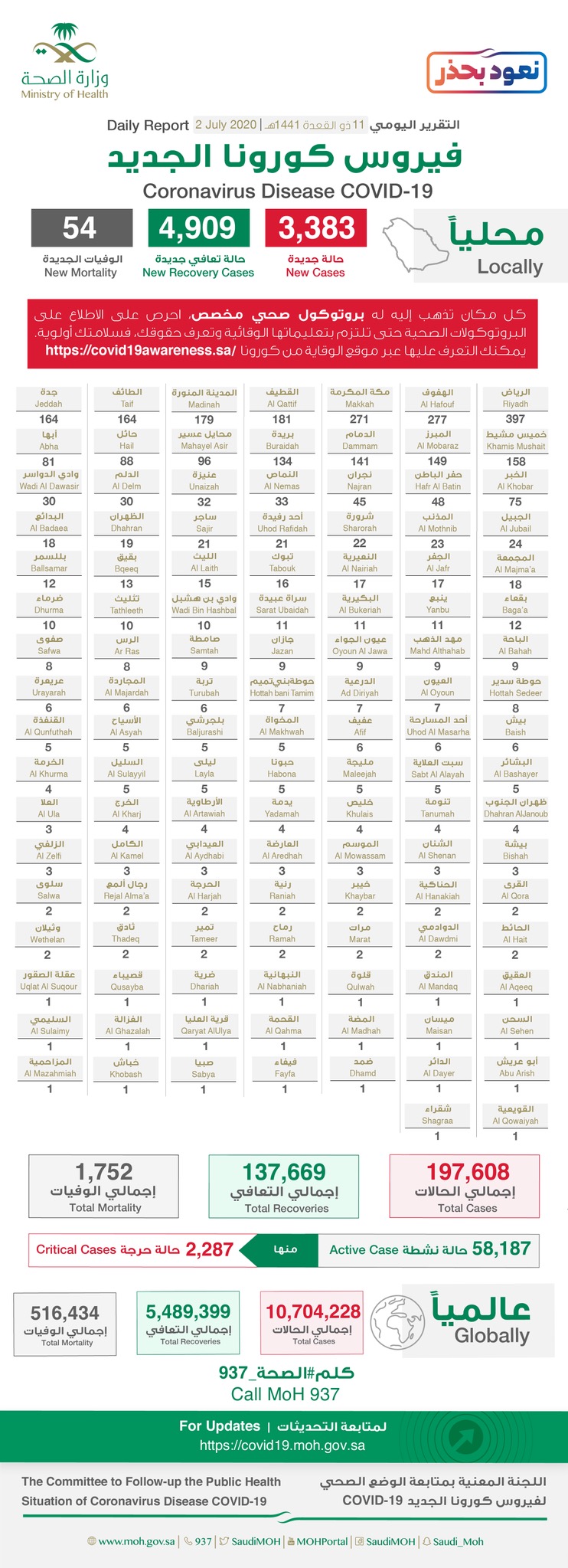الصحة: تسجيل 3383 إصابة جديدة بكورونا.. منها 181 في القطيف و8 في صفوى