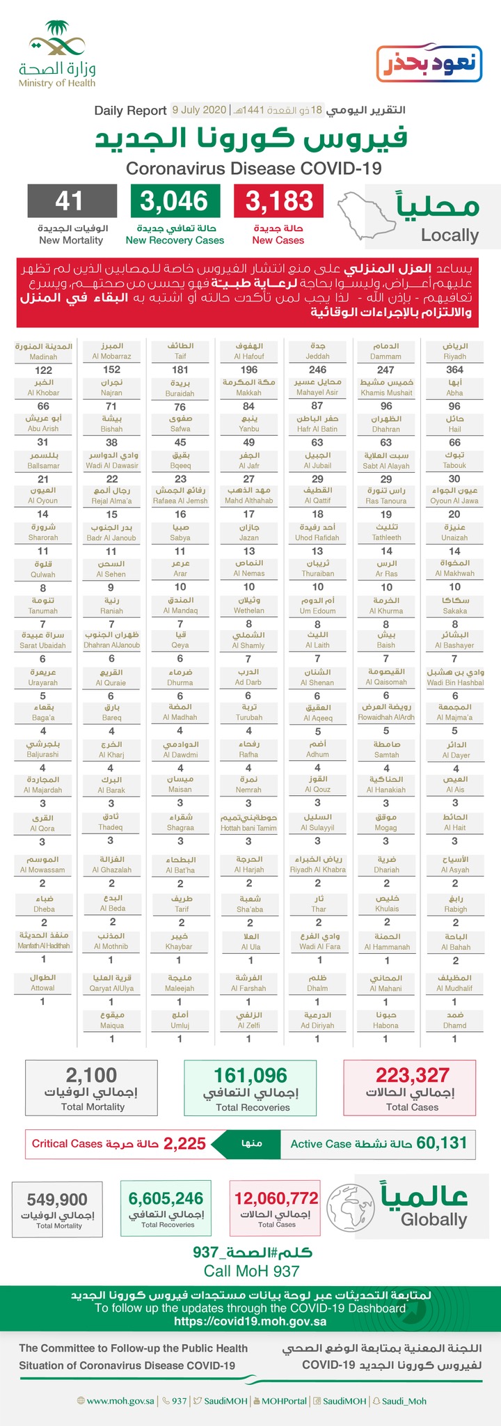 أعلنت وزارة الصحة، اليوم الخميس، تسجيل 3183 إصابة جديدة بفيروس ”كورونا“ المستجد ”كوفيد - 19“ في المملكة. منها 18 في القطيف و45 في صفوى.