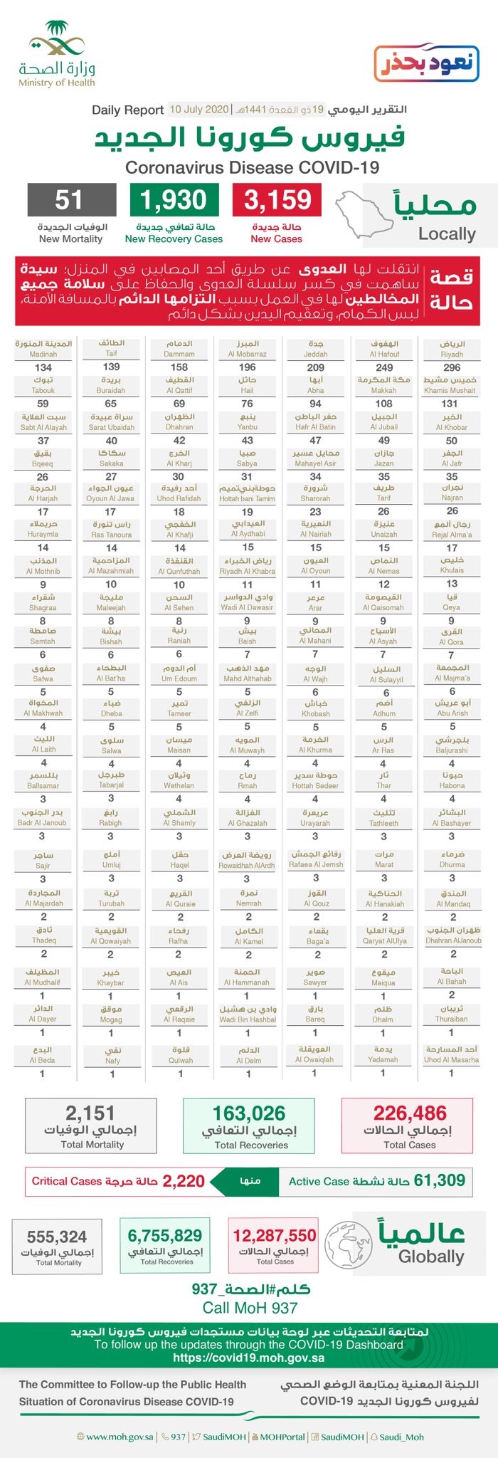 أعلنت وزارة الصحة، اليوم الجمعة، تسجيل 3159 إصابة جديدة بفيروس ”كورونا“ المستجد ”كوفيد - 19“ في المملكة. منها 69 في القطيف و5 بصفوى.
